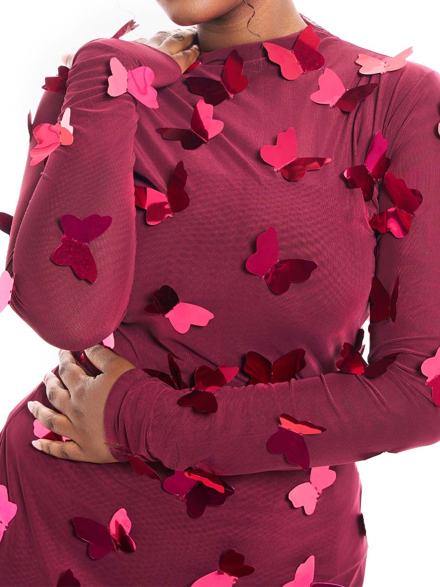 Dripping in richness and grounded elegance, the dress in Cocoa Bronze is a sultry update to the signature silhouette. The stretch mesh base hugs the form, while glistening bronze butterflies catch the light like molten metal. Designed for warm skin tones, golden hour moments, and women who command softness and strength in equal measure.