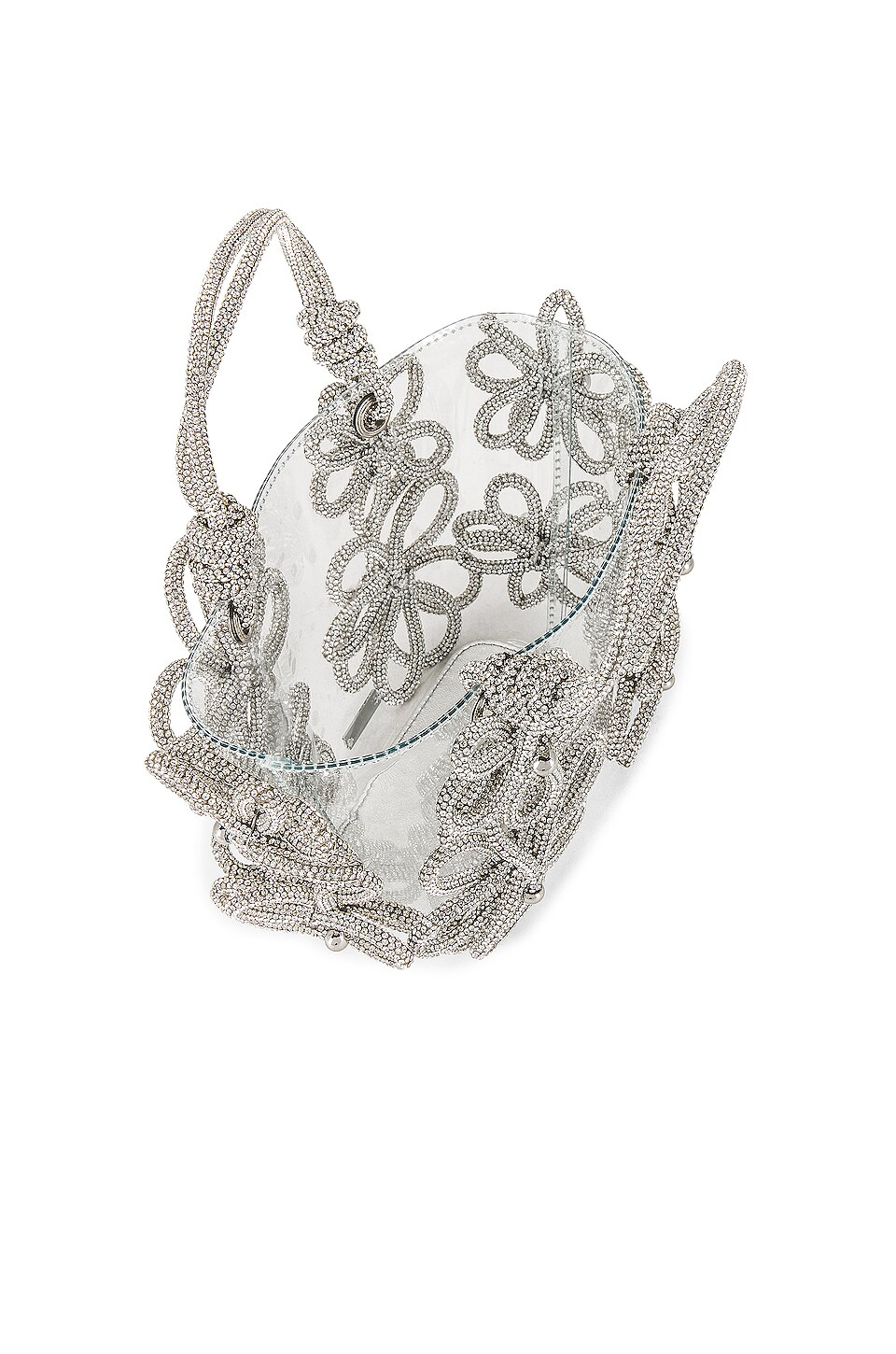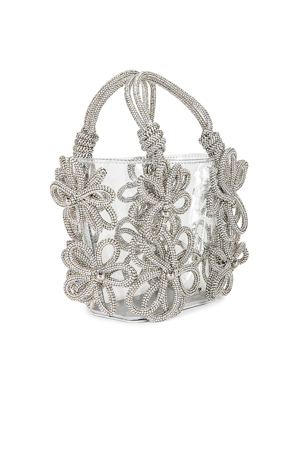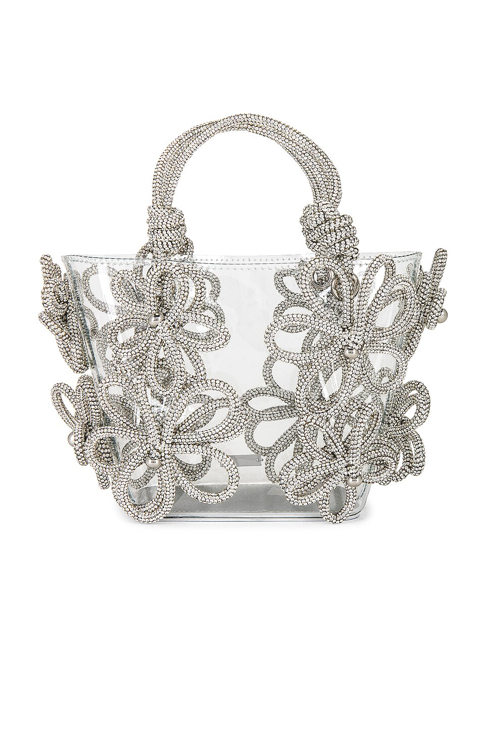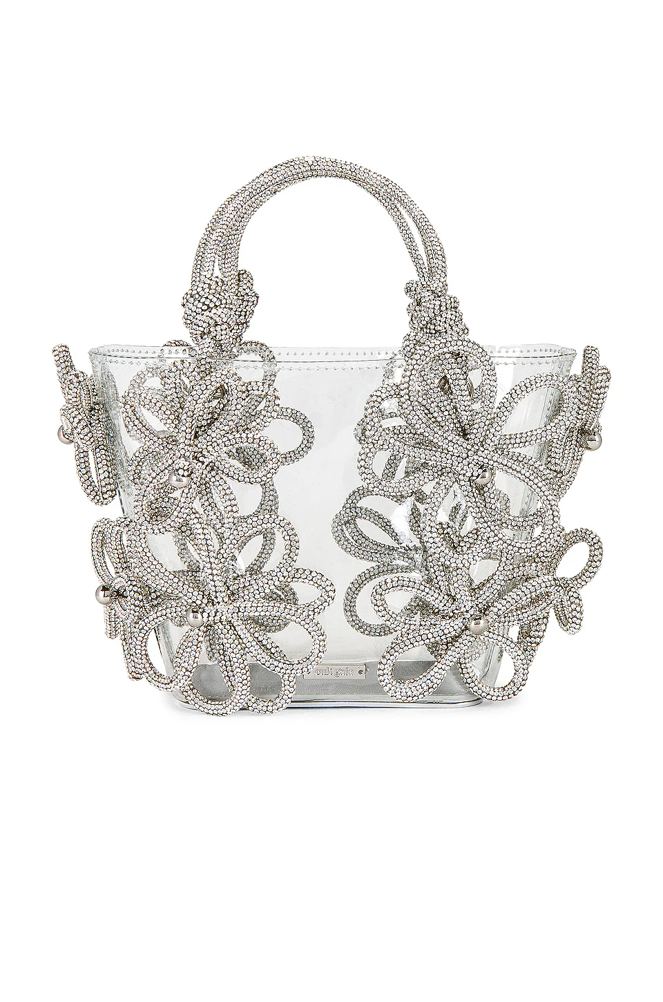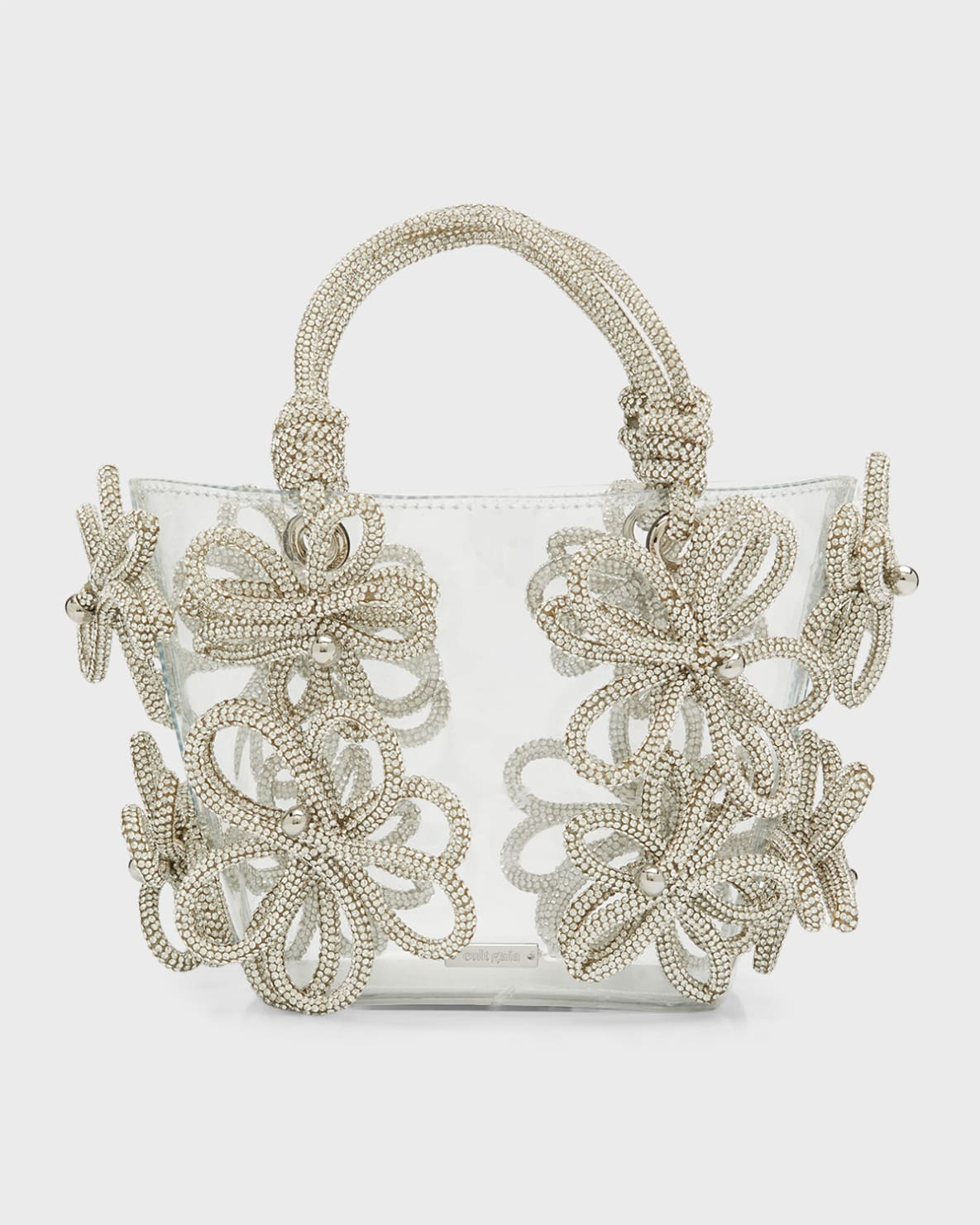 Open top. One main compartment. 3D floral rhinestone cording and signature hardware. Crystal embellished knotted top handles. Measures approx 8.75" W x 5.5" H x 2.5" D.