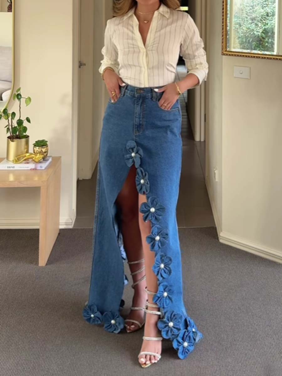 3D Flower Asymmetric Hem Denim Maxi Skirt