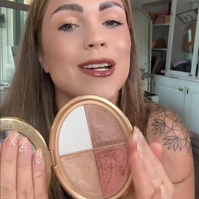 🌸4-in-1 Versatile Palette: This face palette uniquely combines a highlighter, blush, and two eyeshadows in one compact, allowing you to create a harmonious, multi-dimensional look instantly—perfect for streamlining your makeup routine from day to night.