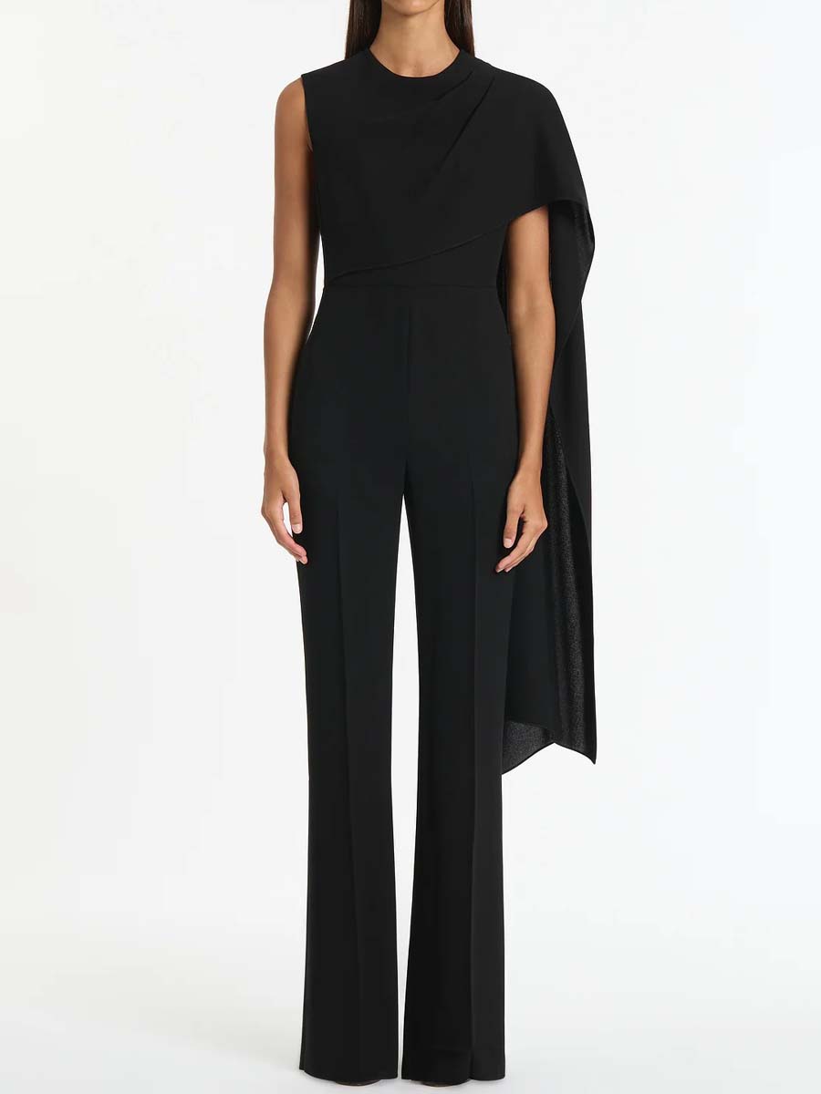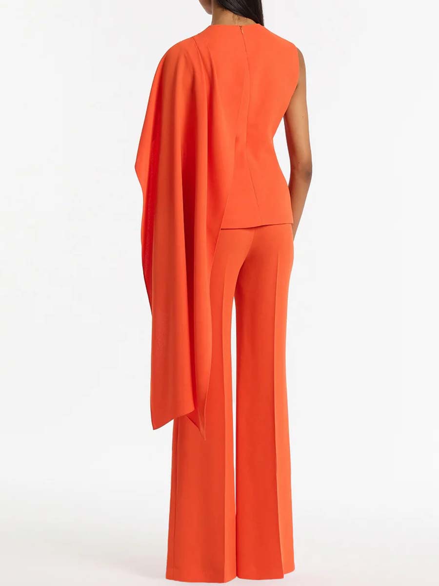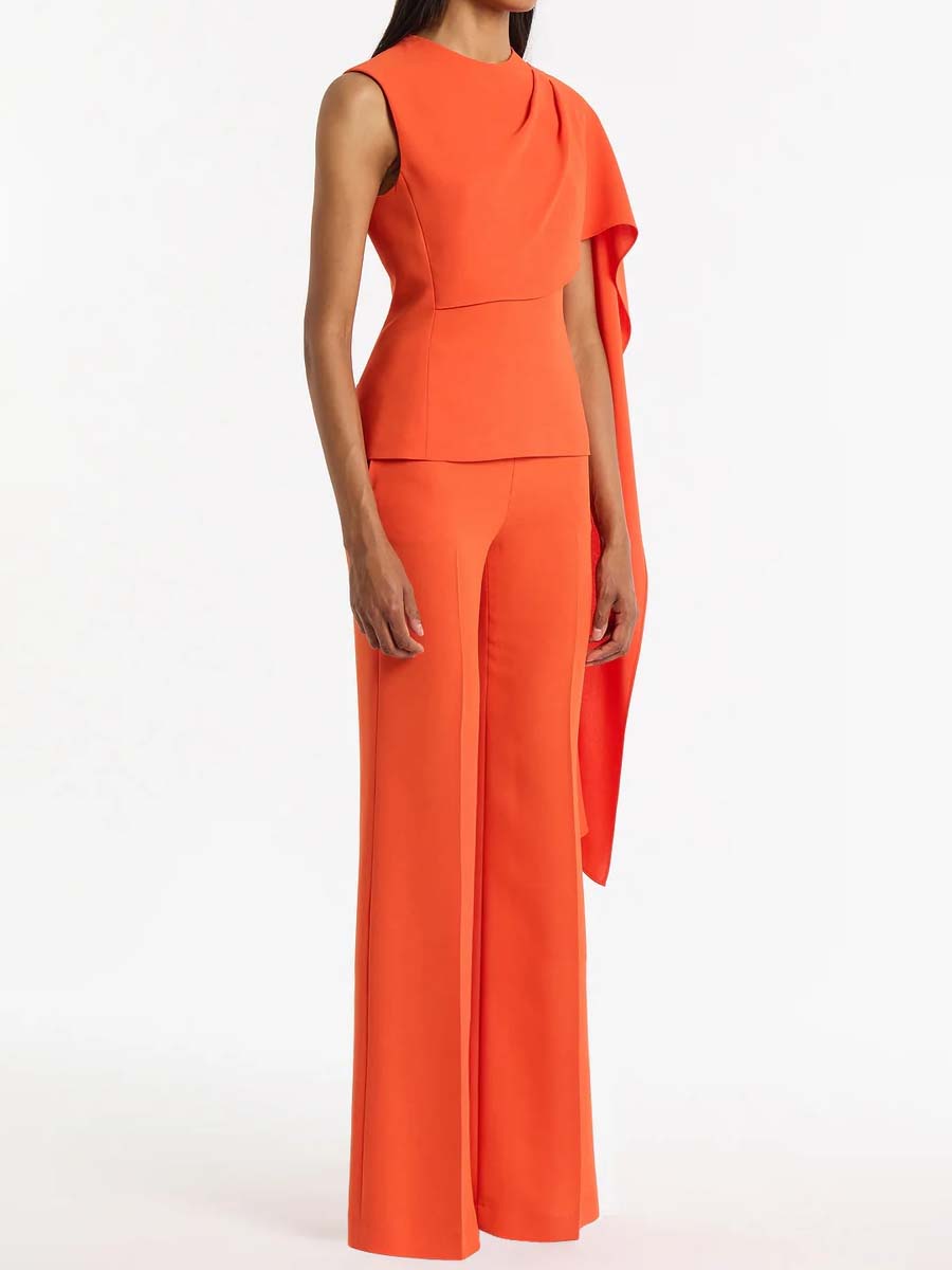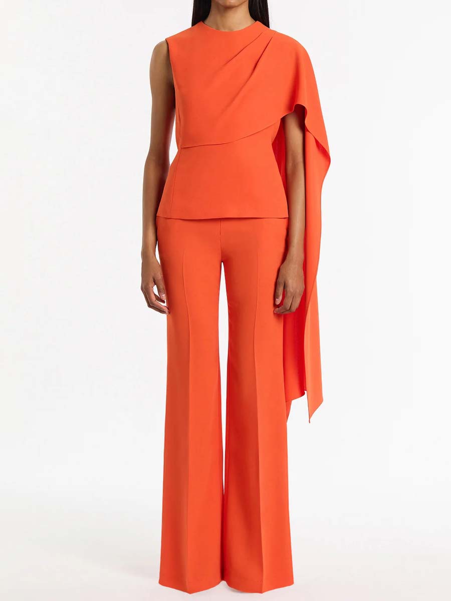 The Tangerine Crepe Cascade Top is a striking balance of structure and fluidity. Designed with an asymmetric silhouette, it features one sleeveless side while the other is draped with a dramatic cape detail. Crafted from luxurious crepe, this bold yet elegant piece adds effortless movement and sophistication to any look.