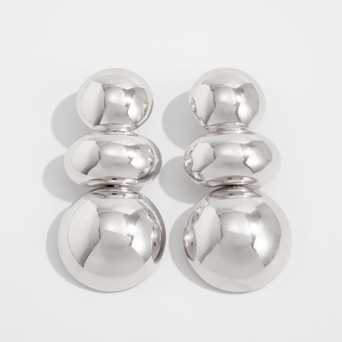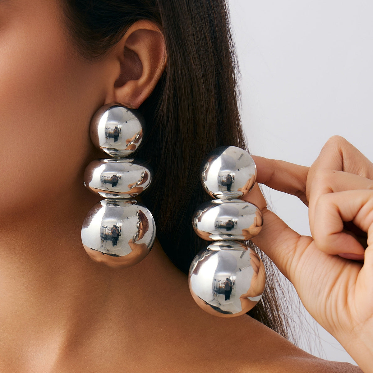 Favors sculptural shapes, so its jewelry often feels like wearable art. These earrings are made from polished gold-tone metal and have stacked orb-like forms that graze the jaw.