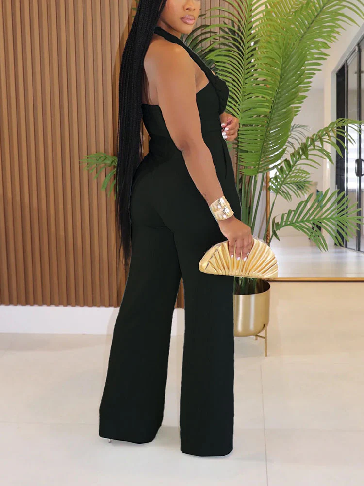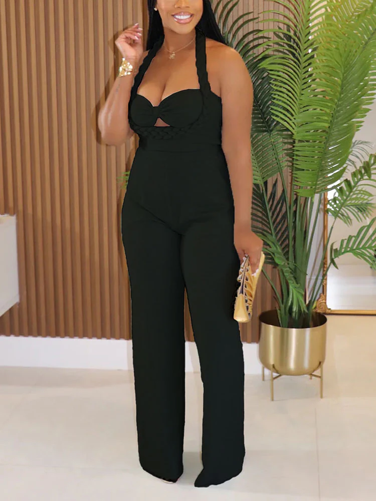 Elevate your style with the Luxe Braided Halter Jumpsuit, a seamless fusion of sophistication and allure. Designed with a statement braided halter neckline and a chic cutout bodice, this jumpsuit flatters with its tailored high-waisted fit and flowing wide-leg silhouette. Perfect for upscale events or a bold fashion-forward moment, this piece exudes effortless elegance with a modern twist.