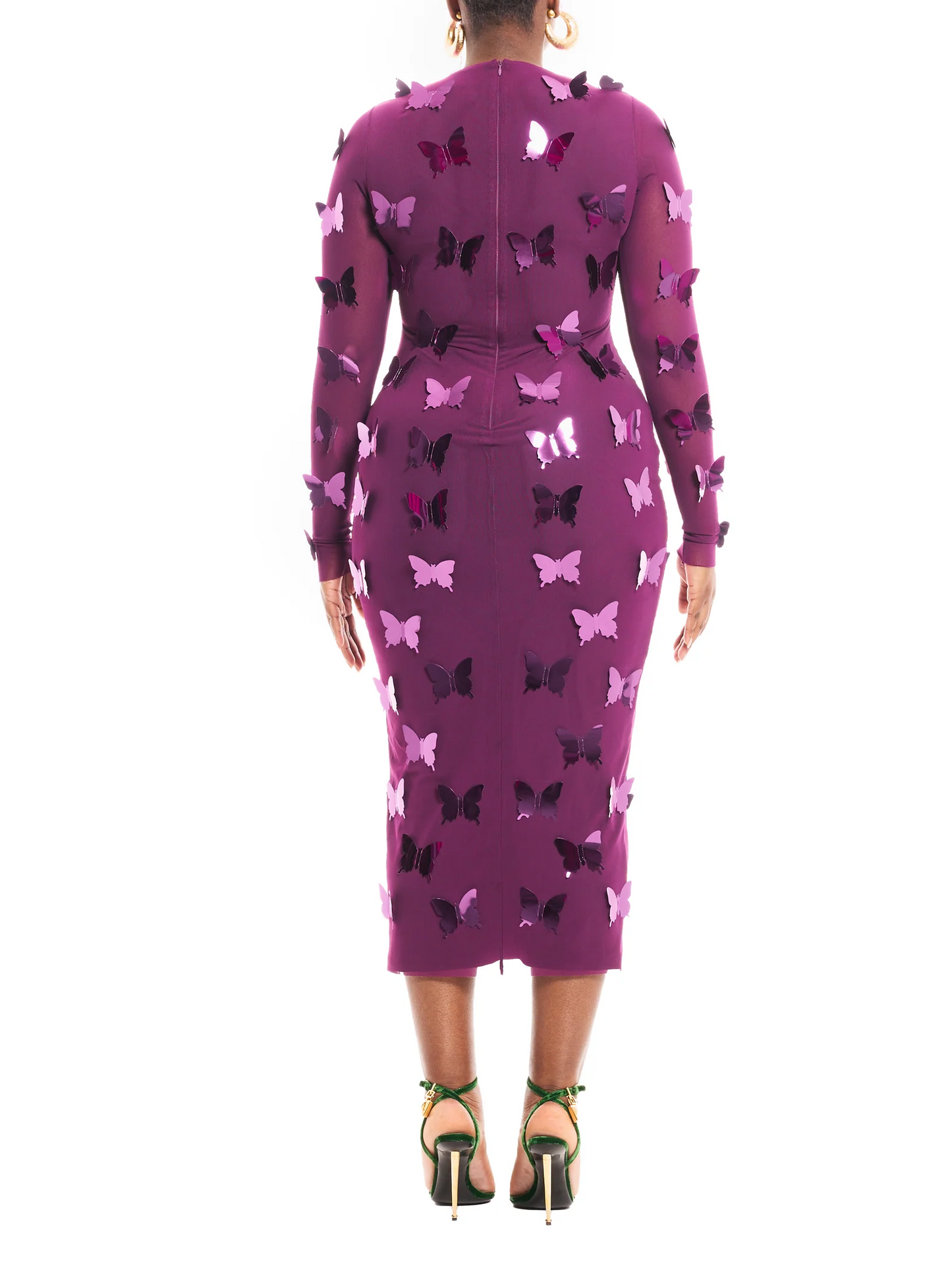 Crafted in rich plum orchid mesh and adorned with dimensional butterflies in tonal purples, this piece glides over the body and finishes just above the ankle for a timeless yet audacious finish. It’s the kind of dress that whispers strength and flutters with grace.