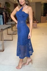 Crochet Knit Oversized Flower Design Halter Texture Maxi Dress
