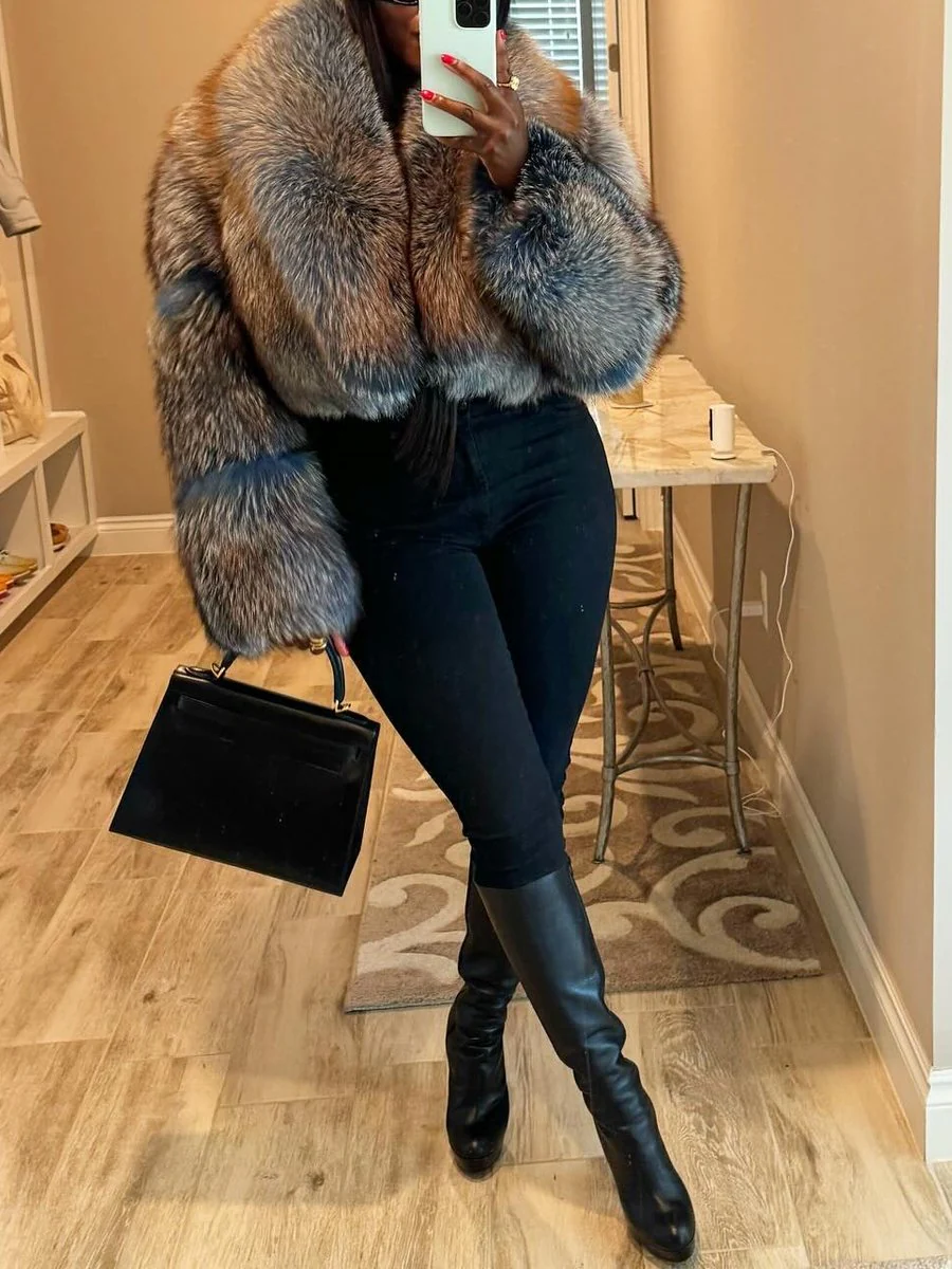 Stay warm, cute, and classy in our cropped fur. It features two pockets and hook closure. This fur runs large. Order one size down. Model is 5'5'', 160lbs, 36 G bust, 29" waist, 43" hips wearing a size M.