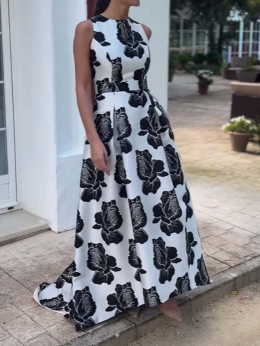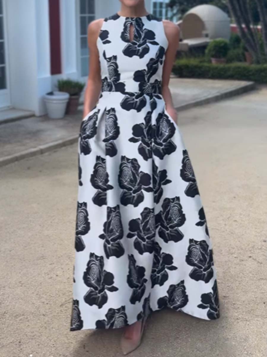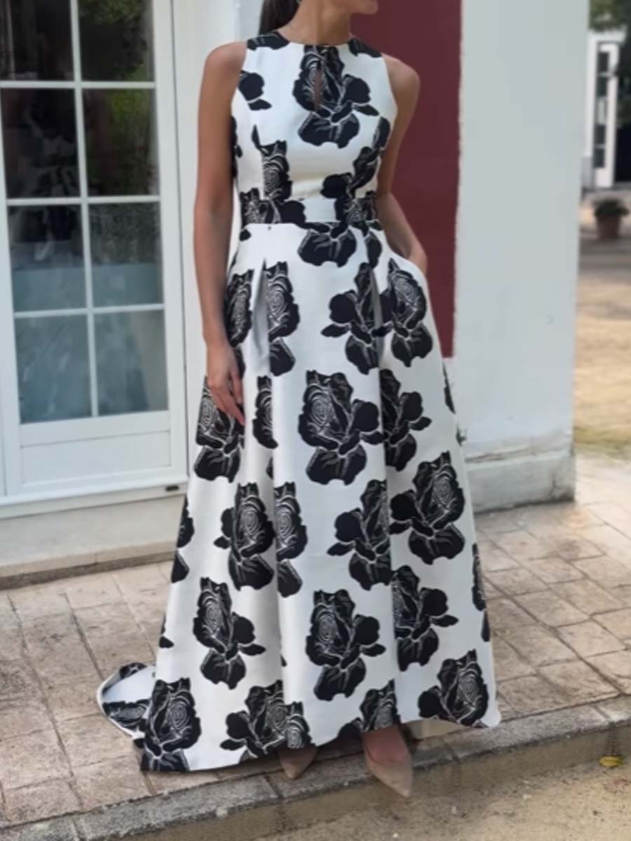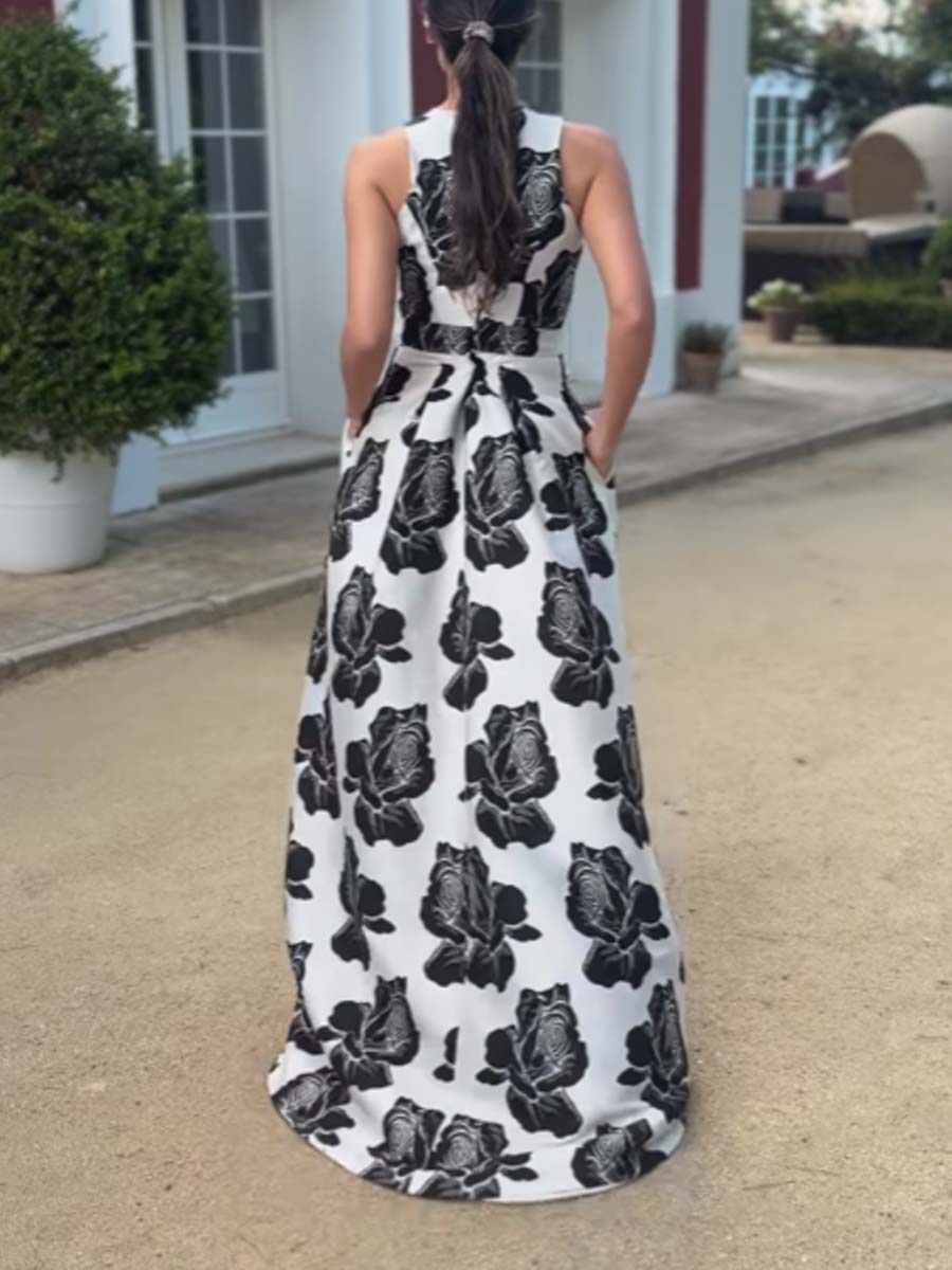 A bold black-and-white floral print defines this sleeveless midi dress, expressing the graphic elegance of the season.