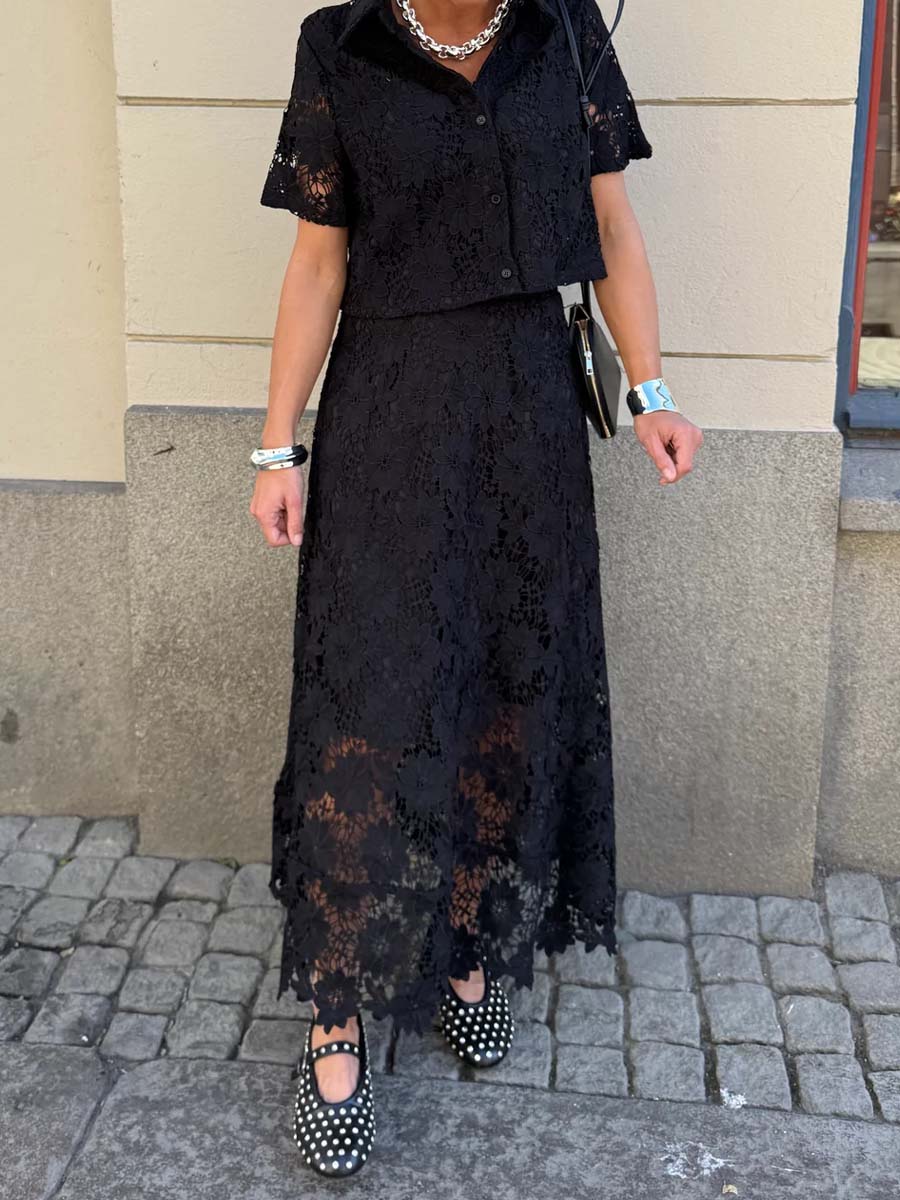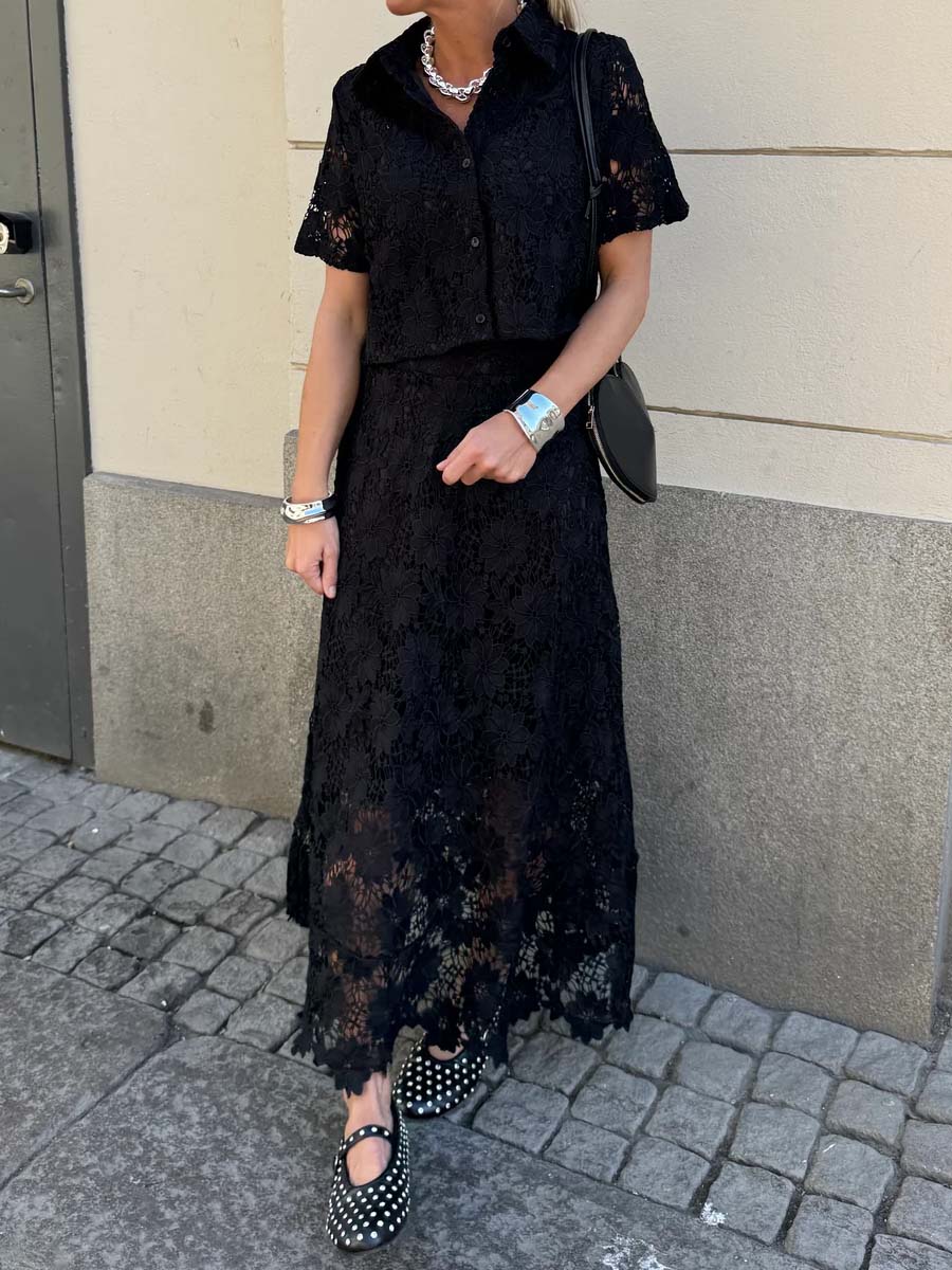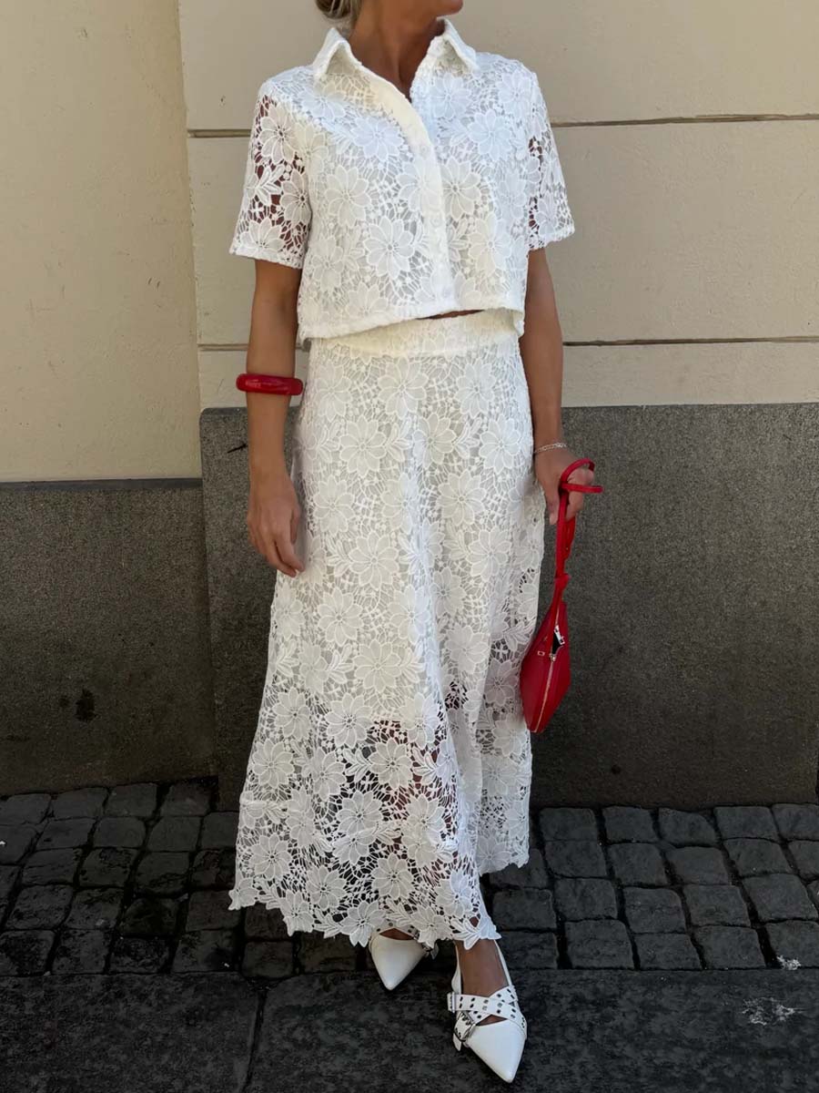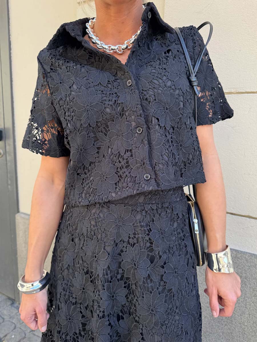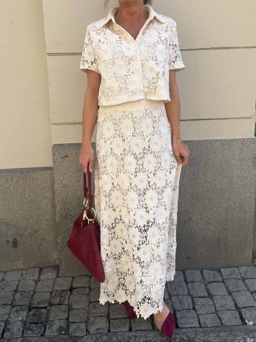 Short-sleeved lace blouse in an elegant off-white tone with a classic collar and half button placket. The airy fit makes it perfect for warm weather – style it with the matching lace skirt for a complete set.