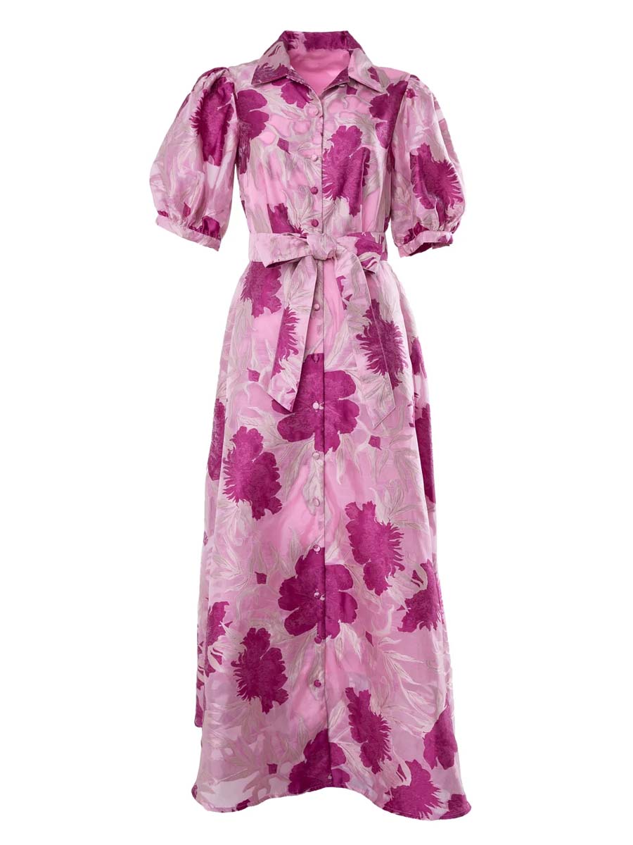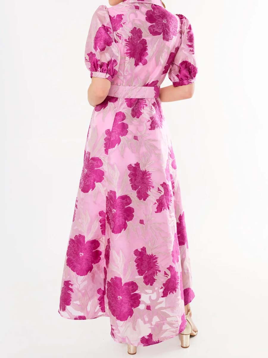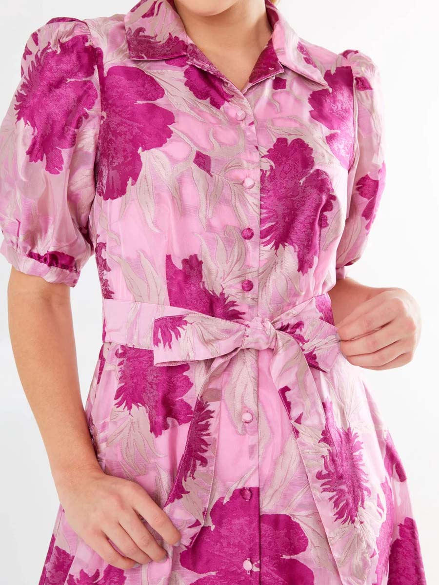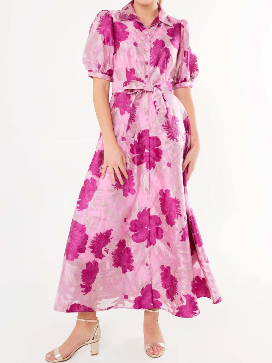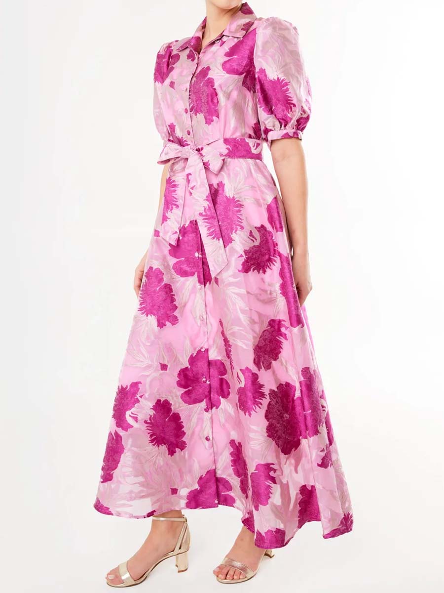 Flamepretty showcases their signature Southern style with this vibrant magenta floral print dress. Its fit and flare silhouette and luxurious jacquard fabrication creates the perfect balance of sophistication and fun. Style with heels and gold jewelry for your next wedding or event.