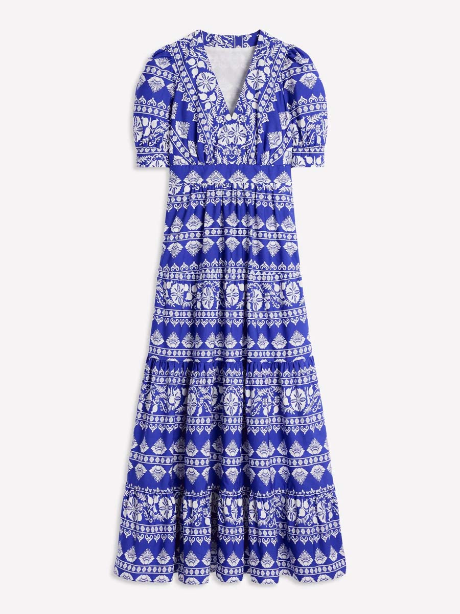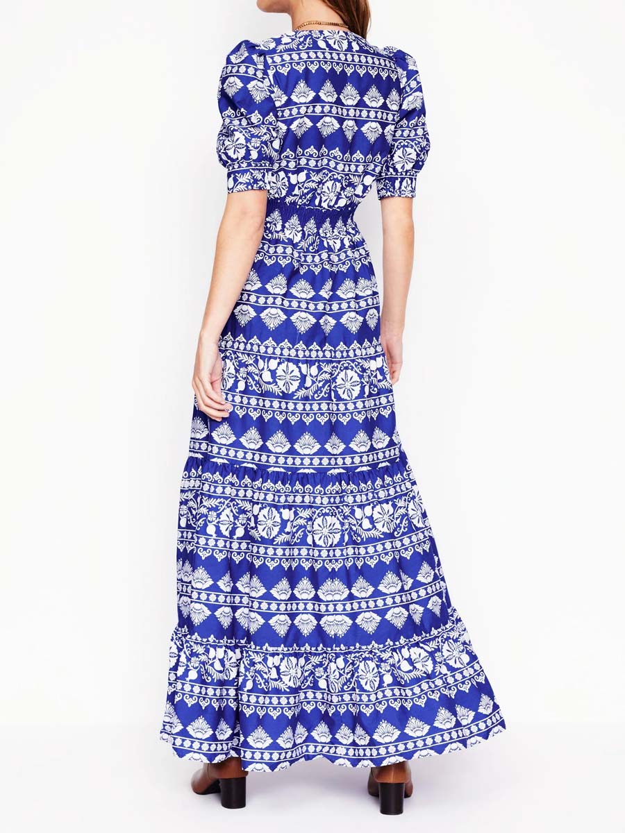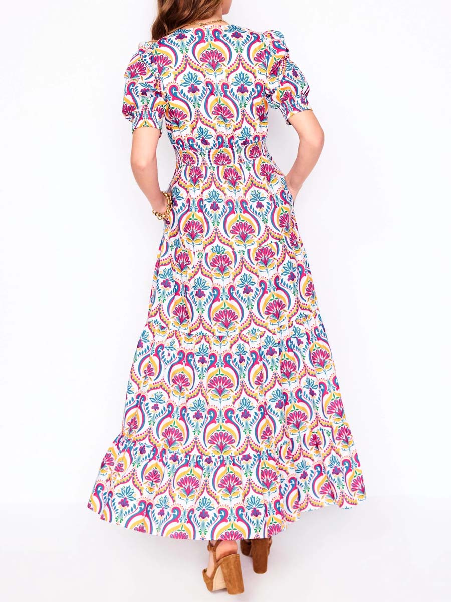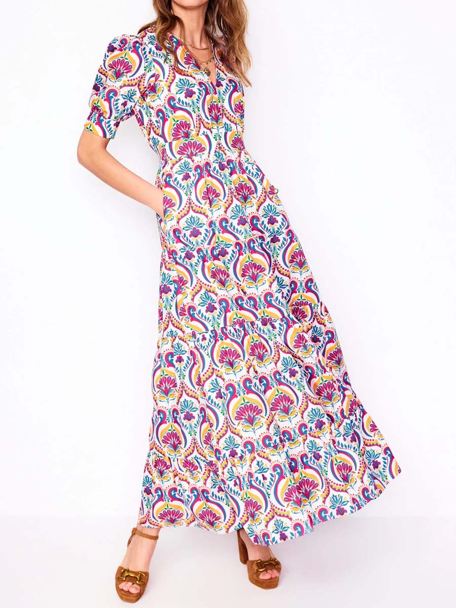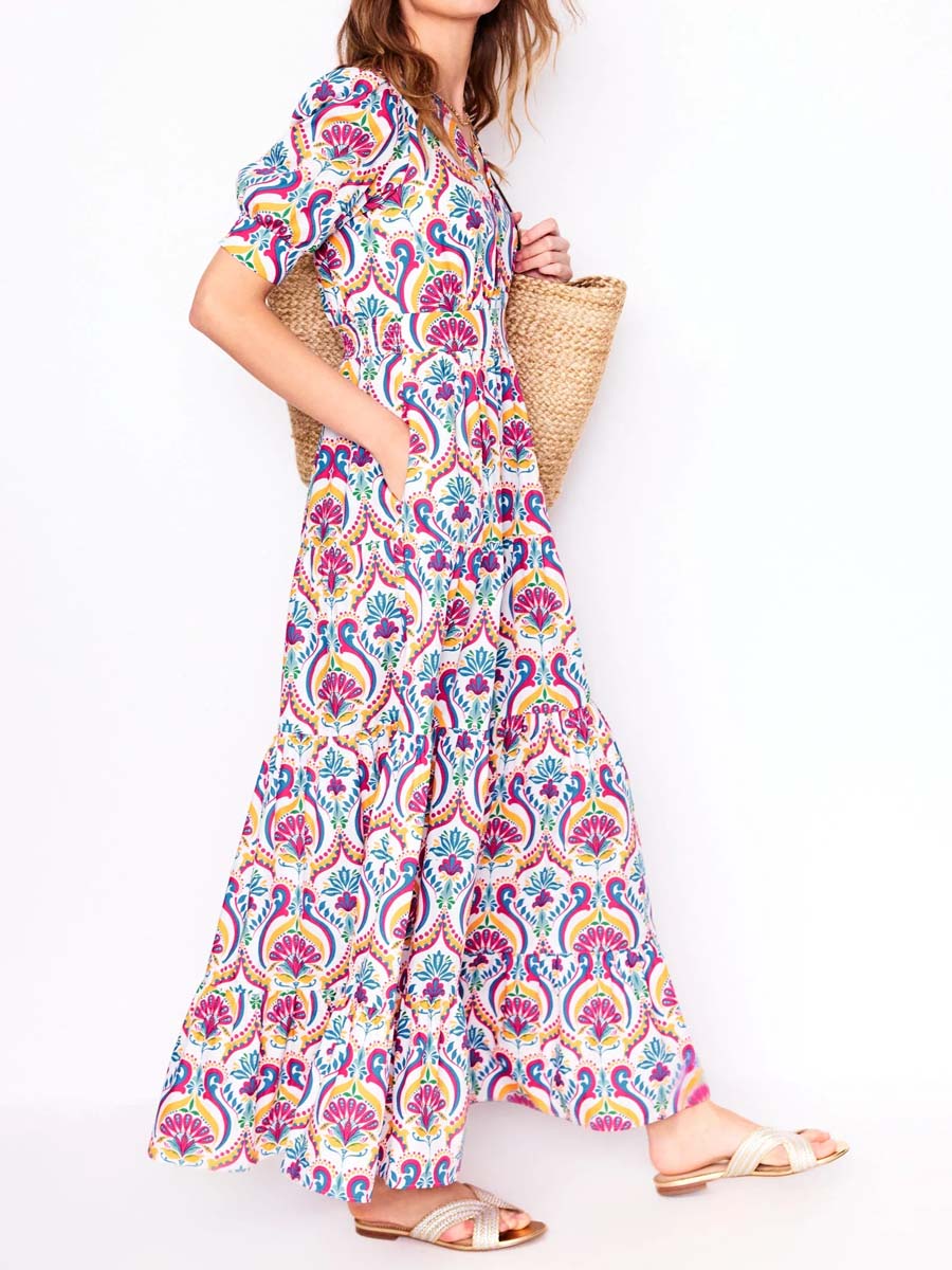 Puff sleeves, pockets and a tiered skirt combine to create our Flamepretty maxi dress. The V-neck adds elegance, while shirring at the cuffs and waistband makes sure it’s comfy.