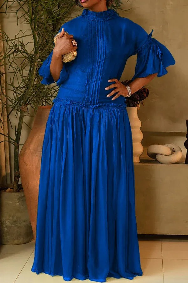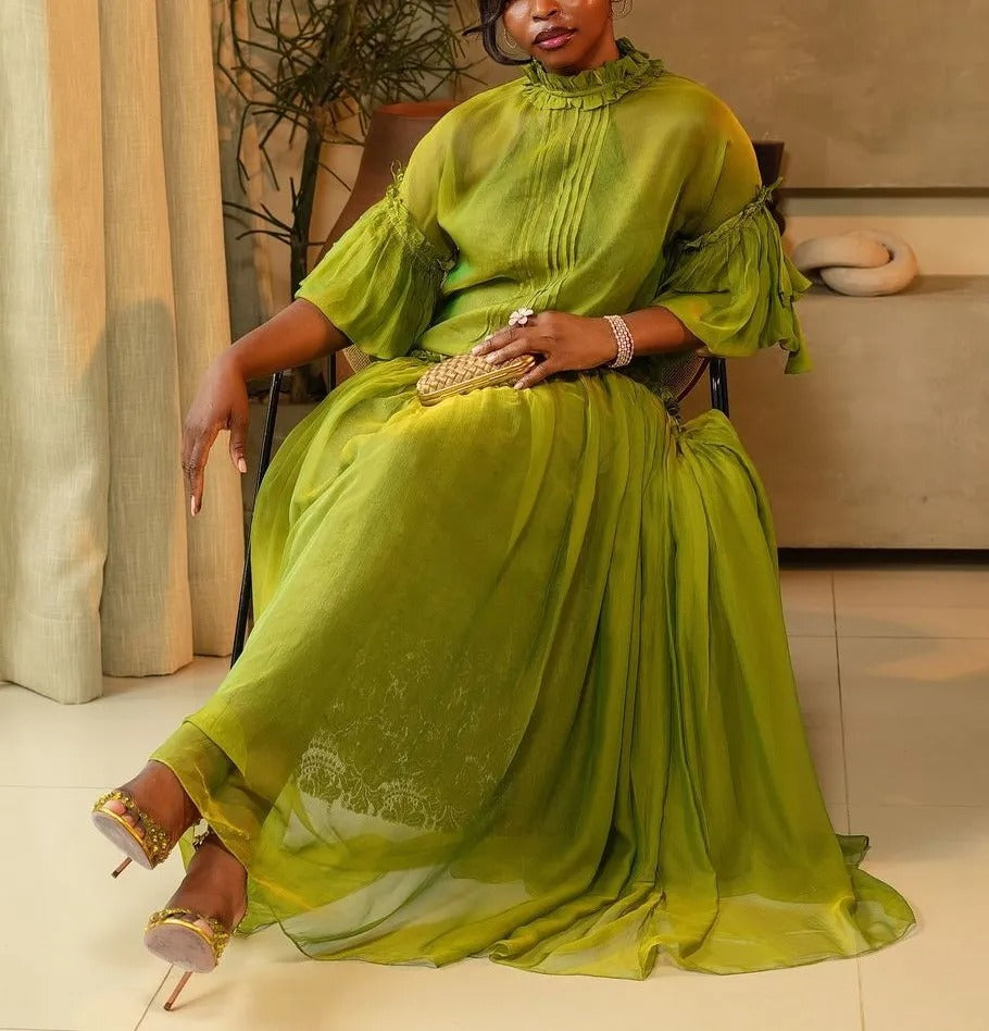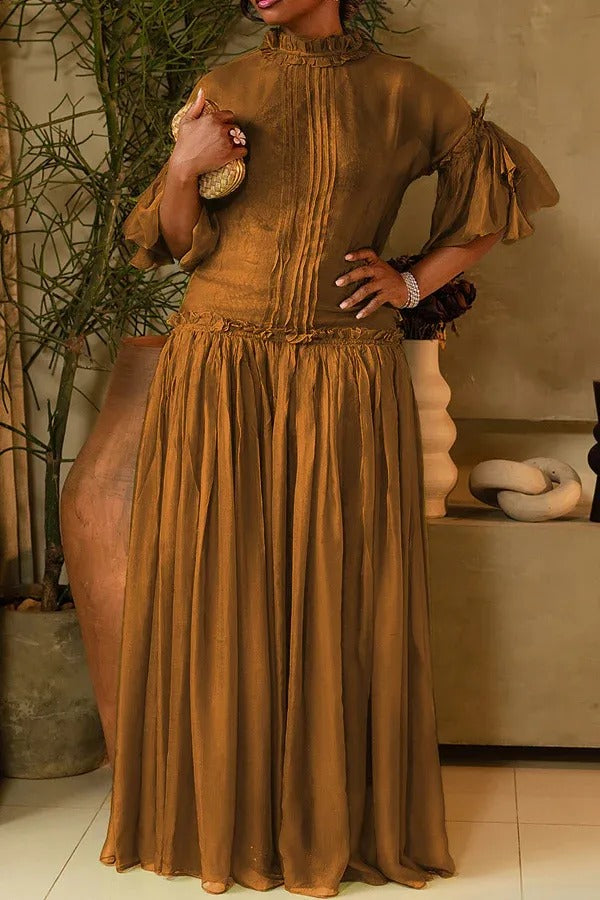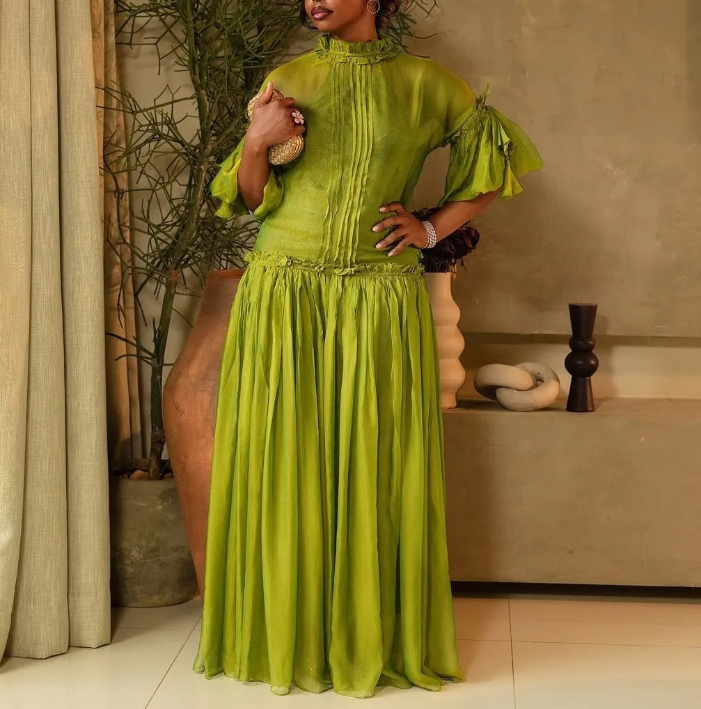This elegant dress with a relaxed fit and soft, airy fabric. The top features a high, ruffled neckline with subtle front detailing, and the sleeves are three-quarter length with additional ruffle accents that gather at the arms. The skirt begins at the waist with a gathered design, creating volume and movement that continues down to the floor, giving it a graceful and ethereal quality.