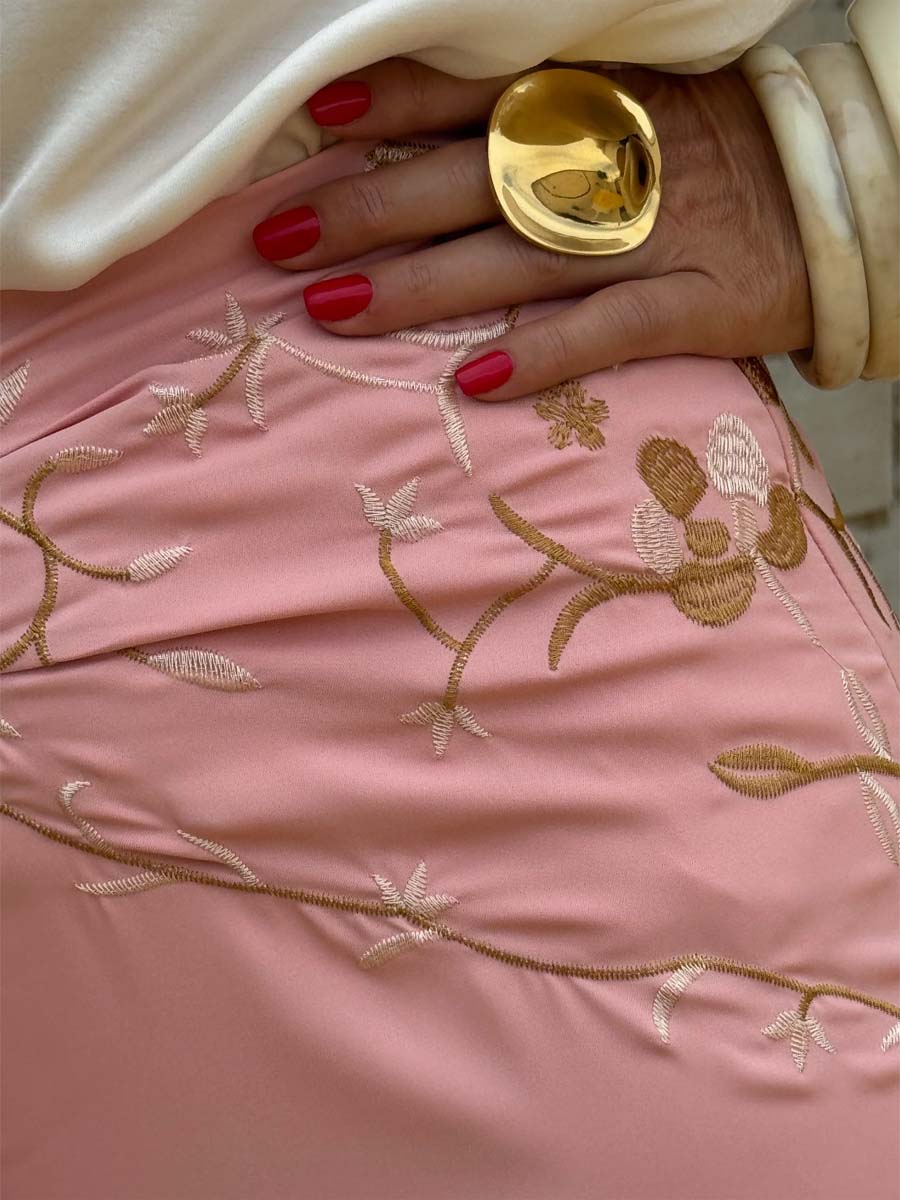 The fabric of this skirt is embroidered with gold and beige colored threads