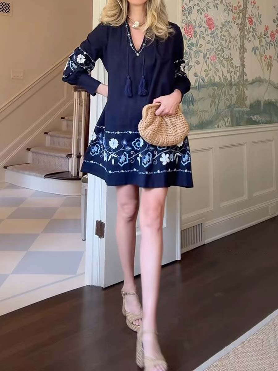 Elevate your style with our intricately hand-embroidered button-cuff long-sleeve dress. The v-neckline, adorned with charming tassels, adds a touch of bohemian elegance. Each dress showcases meticulous craftsmanship, featuring exquisite patterns that highlight exceptional artistry. Perfect for any occasion, this unique piece effortlessly combines timeless elegance with modern flair.