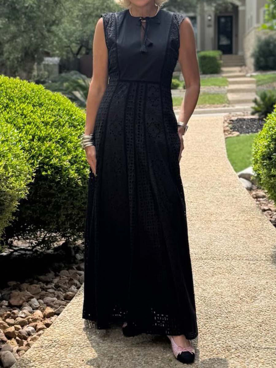 Expertly tailored from lightweight cotton, the black sleeveless dress is defined by an elegant, sweeping maxi silhouette and a charming allover eyelet design. A split-v neck with tassels complete the look. Sophisticated yet effortless—this is how you do best-dressed guest for balmy summer days. Style with chic flats or strappy slingbacks.