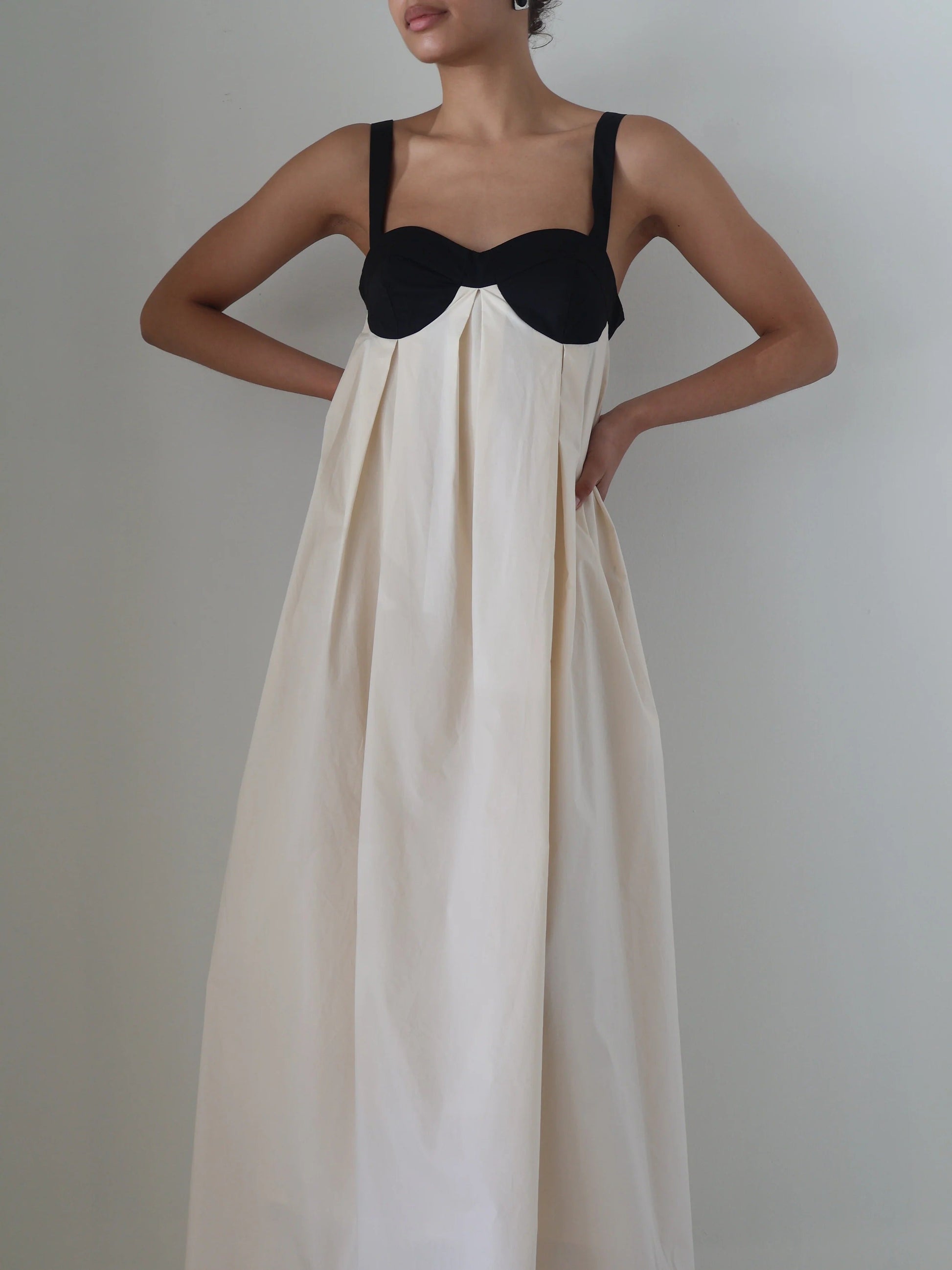 he dress showcases graceful box pleats throughout in a serene sea salt hue. It is designed with a striking black bodice, a low scoop back accented with a delicate tie detail, and convenient side seam pockets. The sleeveless maxi silhouette exudes effortless sophistication.