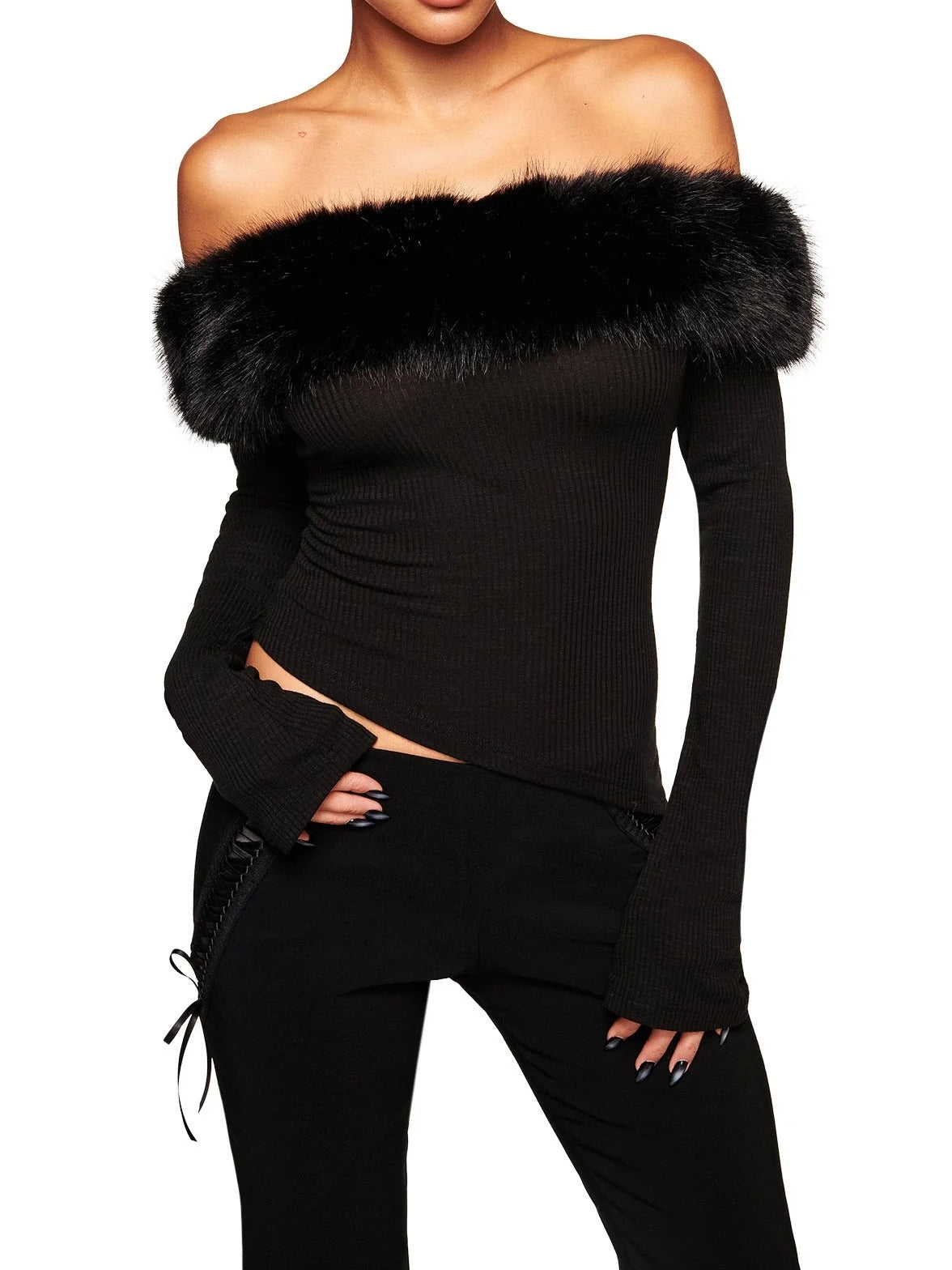 - Off-shoulder long sleeve top in black rib fabrication