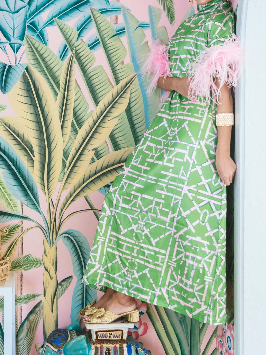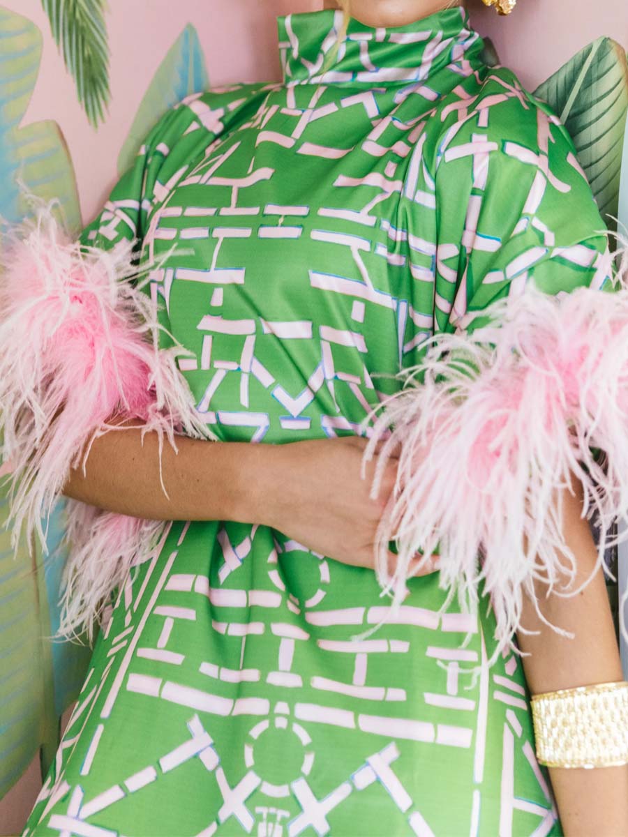 The event of the season is in full swing. As we enter high season, excitement fills the warm, salty air and the smell of champagne and roses blanket the room.Watch The Darling as she floats through crowd. Feathers of pink dancing in the air on a draped, polished fabric in spring green. A bow is tied softly along the trellis patterned neckline. Magic, darling you are pure magic.