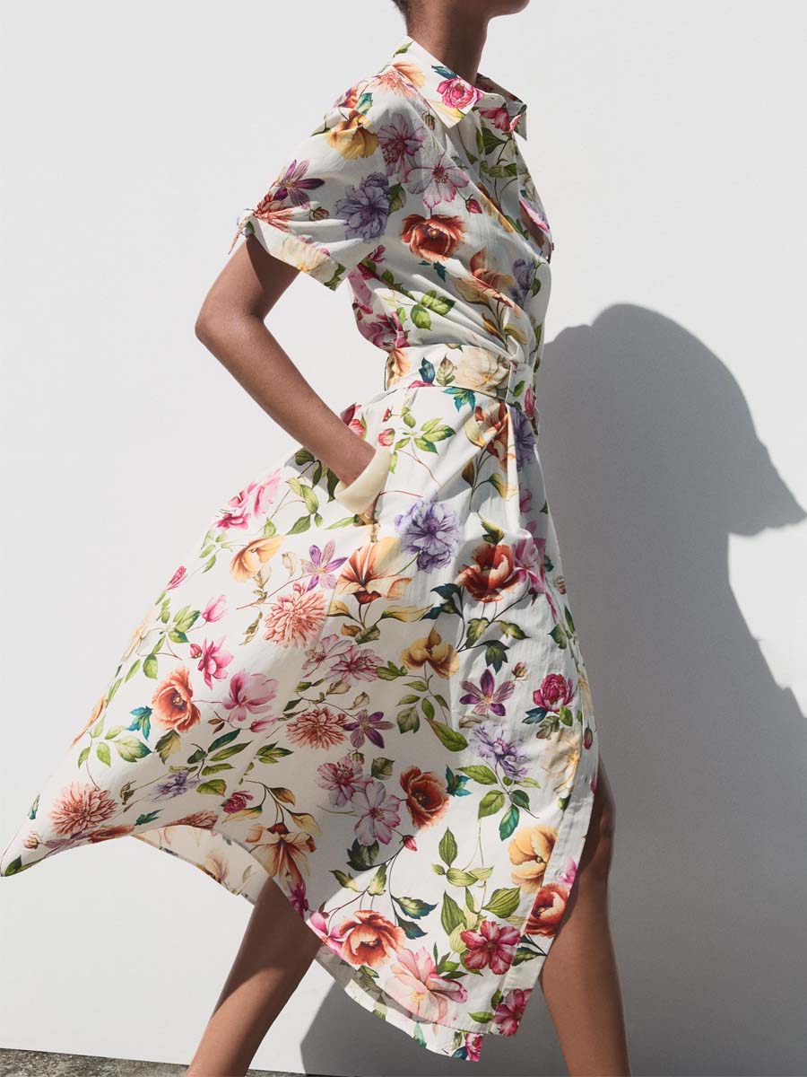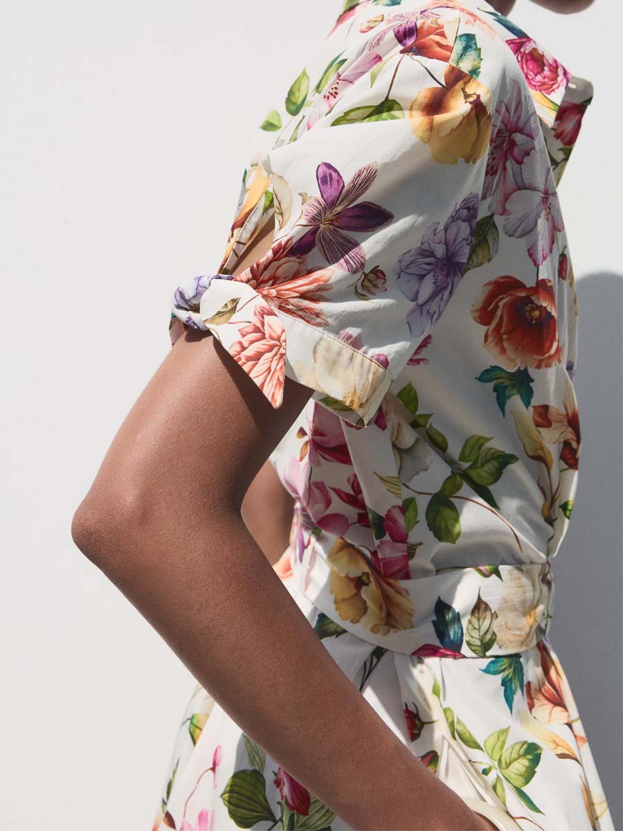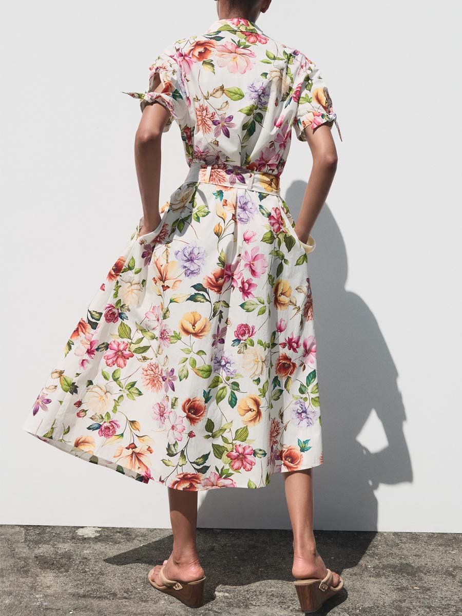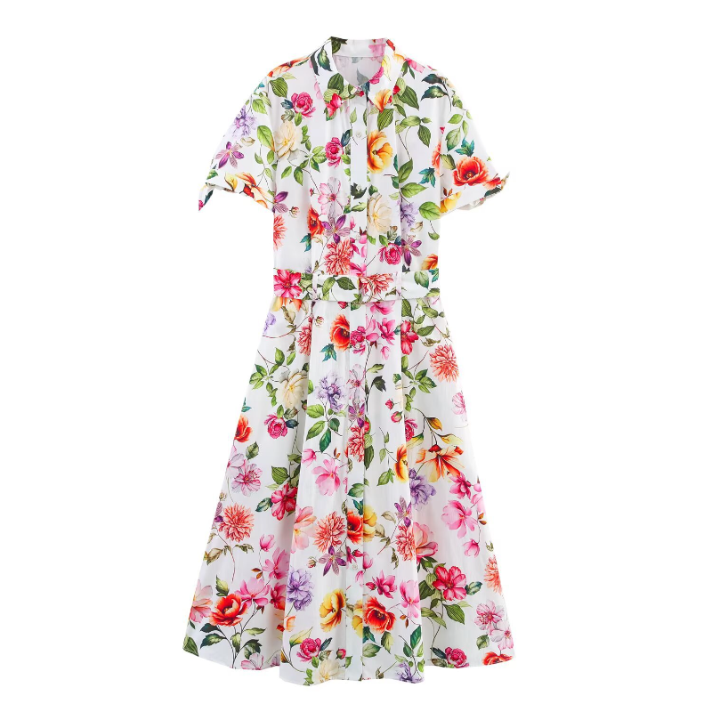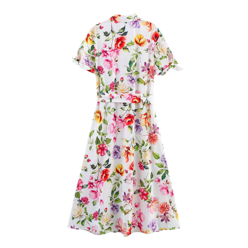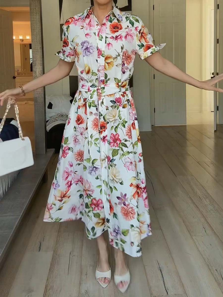 Dress with lapel collar and short sleeves with tie. Matching fabric belt detail. Front button closure.