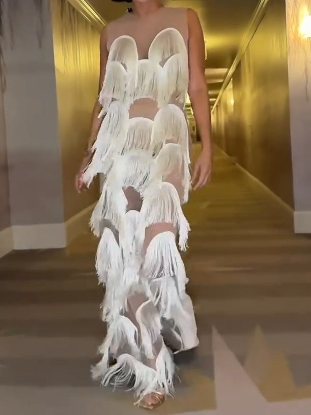 The Fringe Gown is a stunning example of the brand's artistry. This gown features a panel of delicate, sheer mesh with bold fringing in a scalloped pattern. The fringing cascades down the front of the gown, creating a floating effect. The gown is sleeveless and has a round neck. The gown is made of a lightweight fabric and features a back zipper closure.