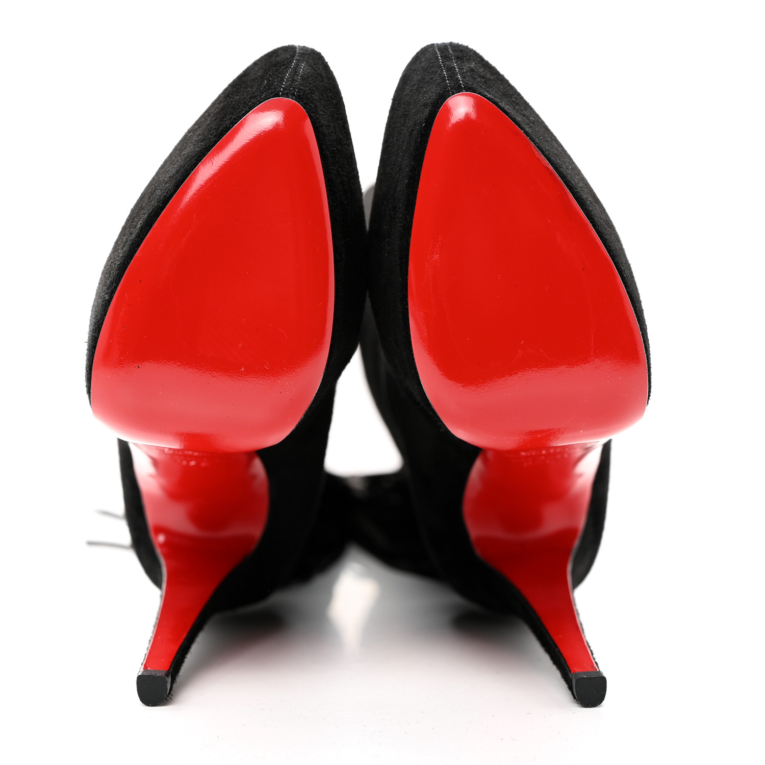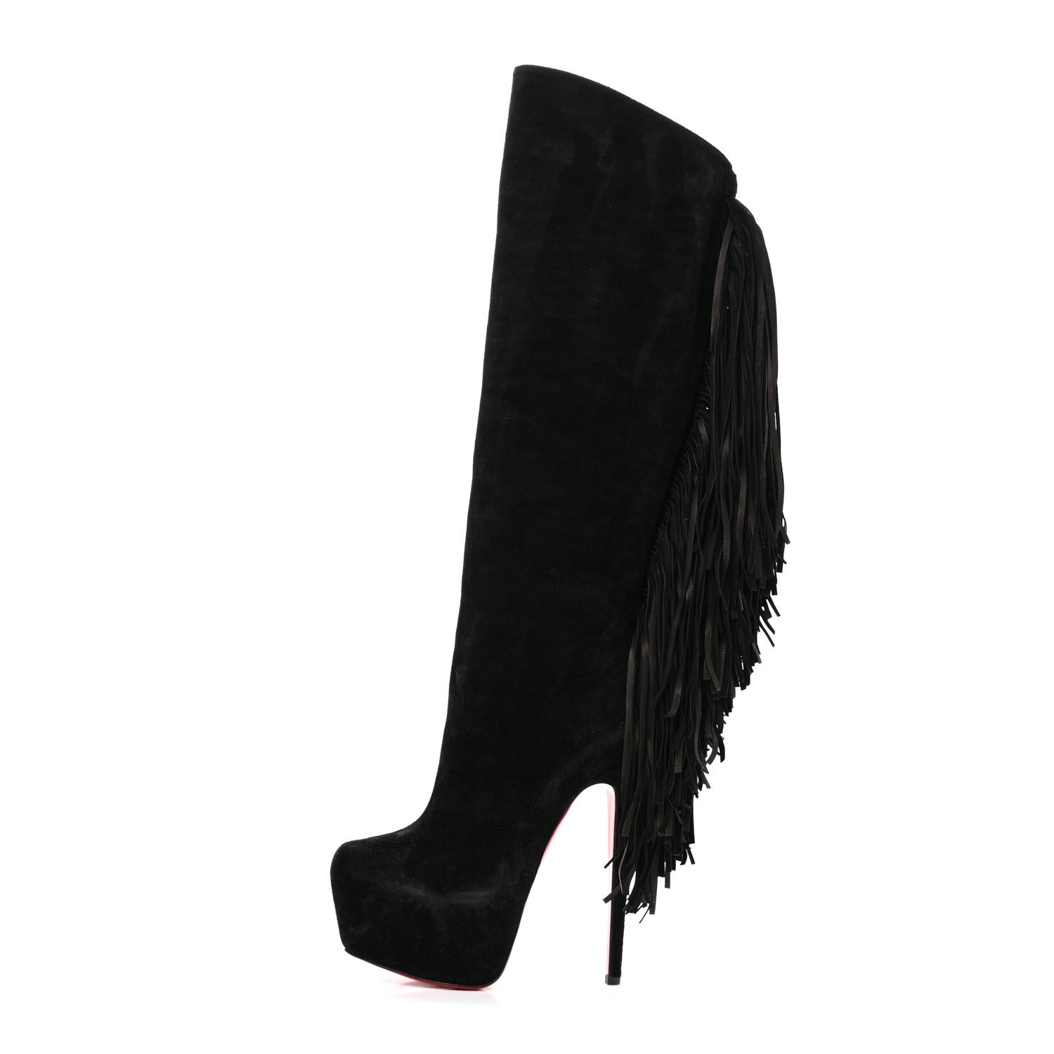 These chic boots are crafted of suede leather and fit just over the knee with fringes along the back of the shoes. These have a 6 inch stiletto with an elongated toe.