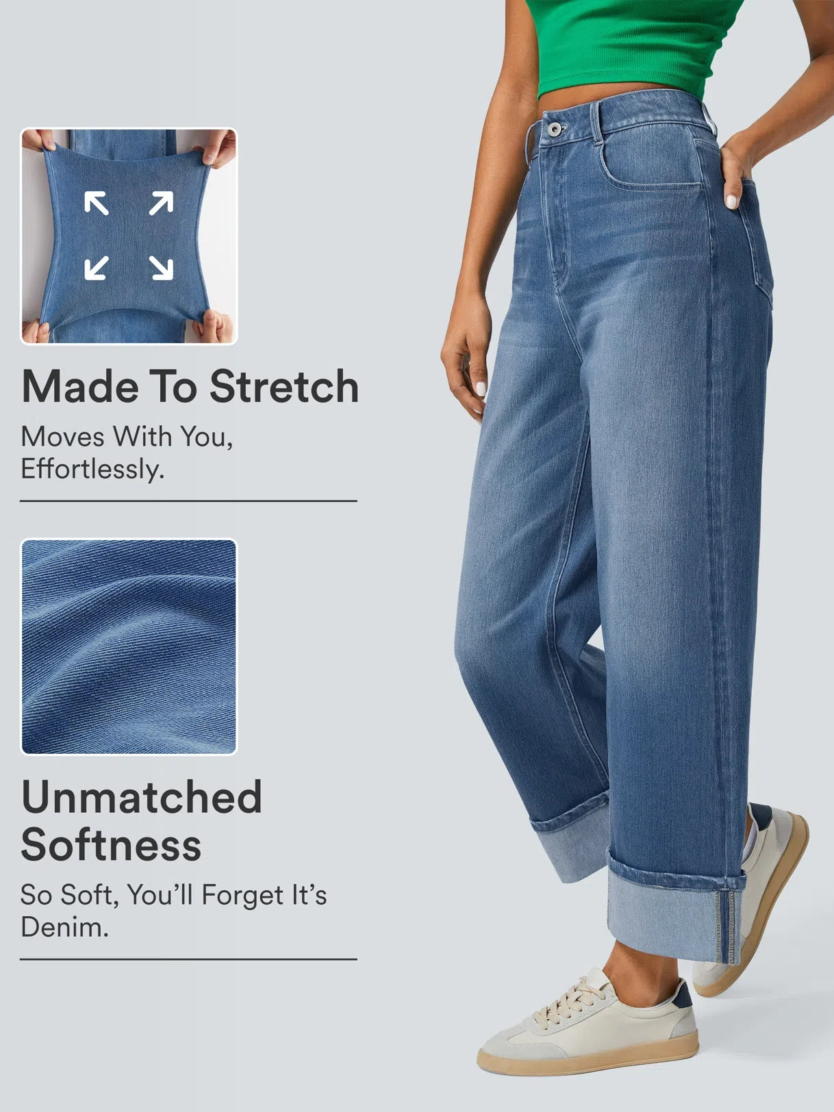 Denim redefines jeans with the comfort of athleisure. Designed with soft stretch that moves freely with you for unlimited comfort.