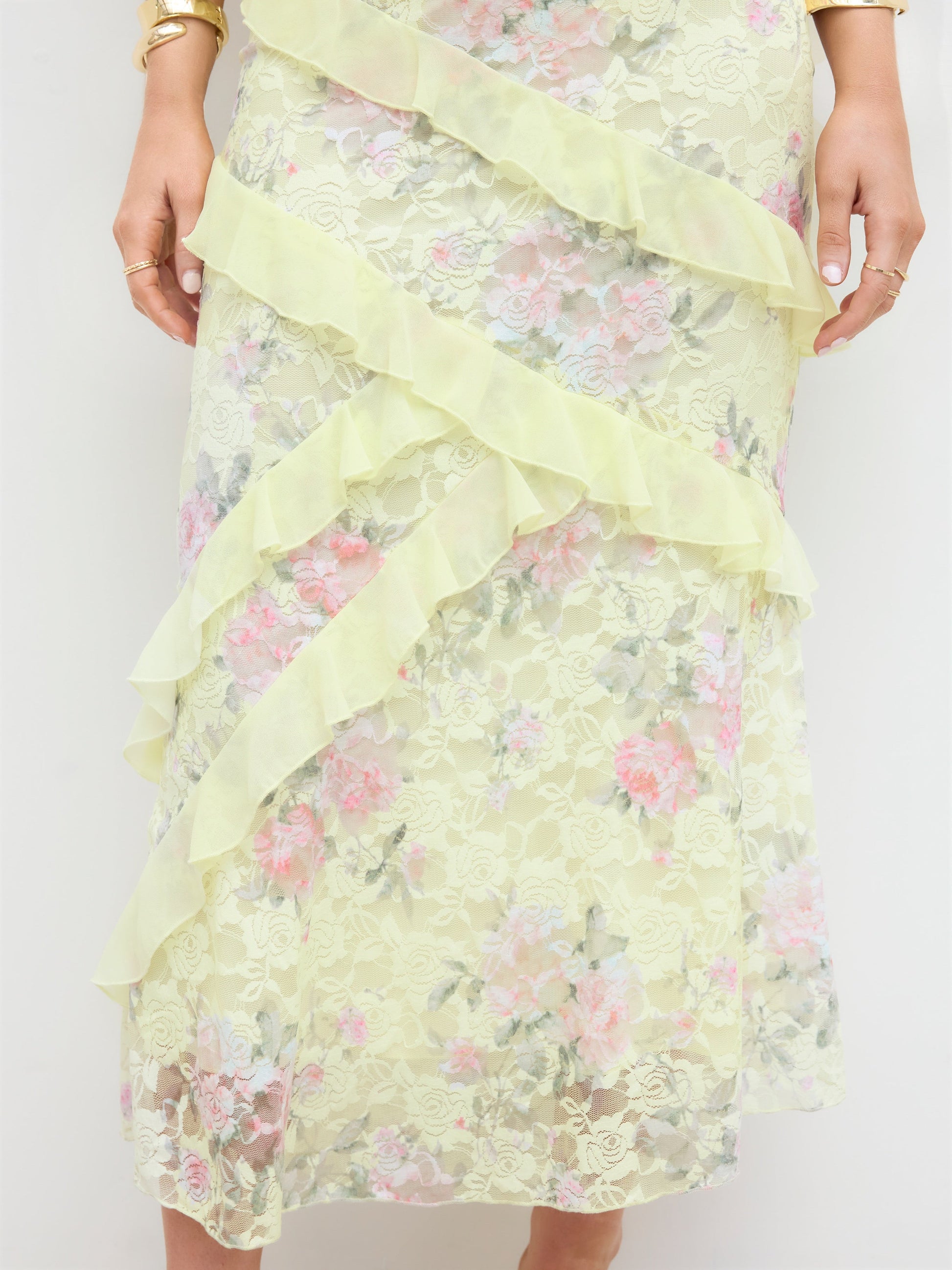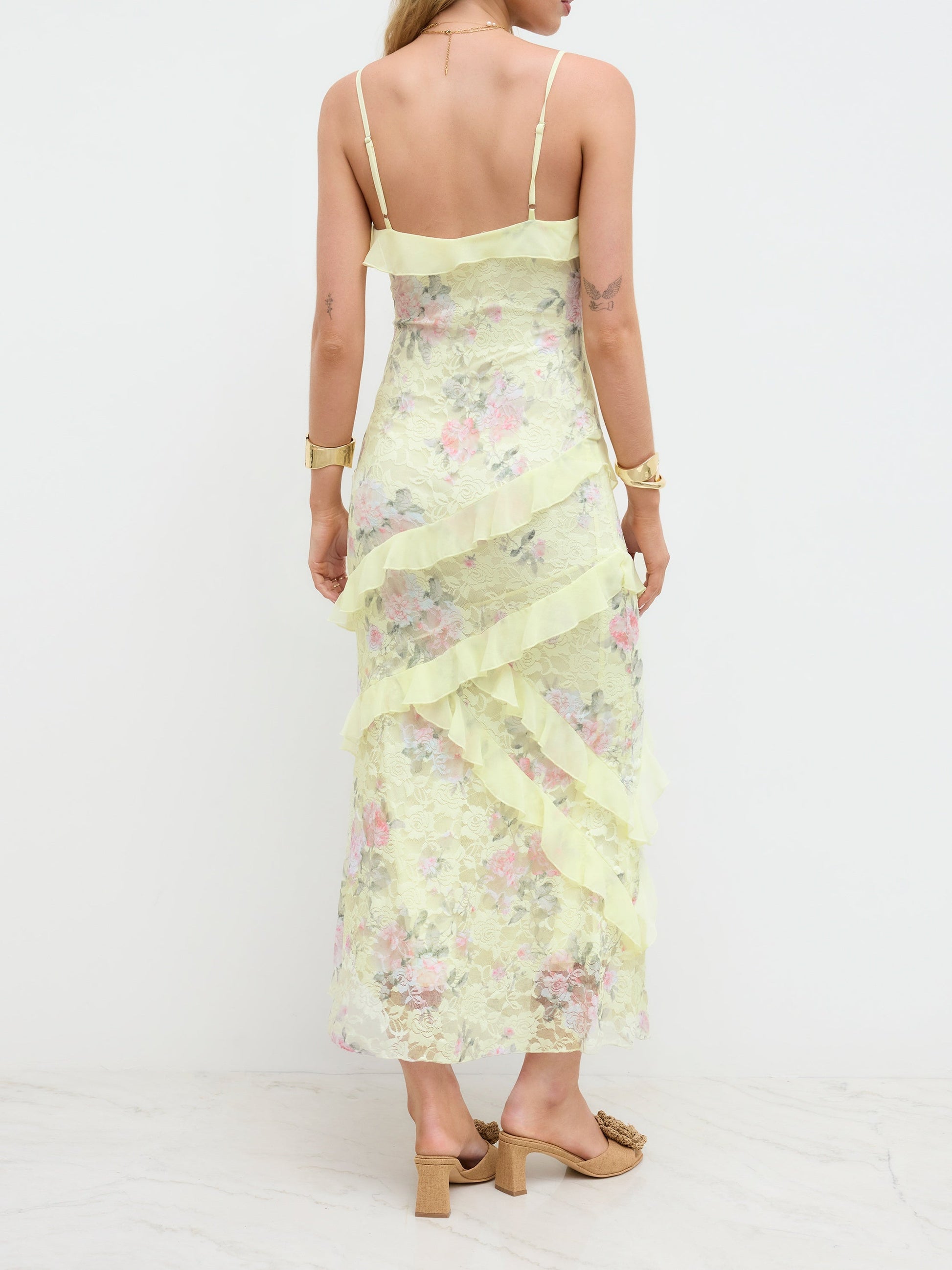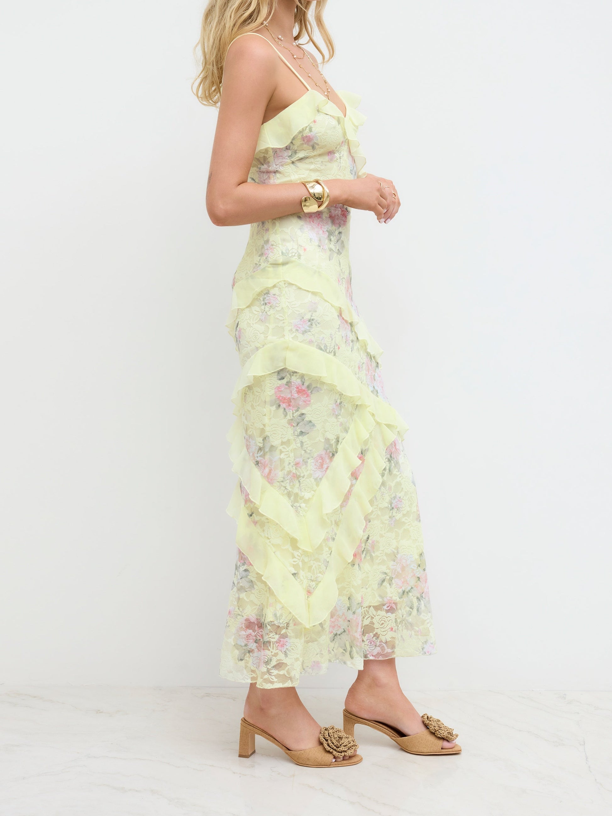 Lace V-neck Floral Ruffle Maxi Dress