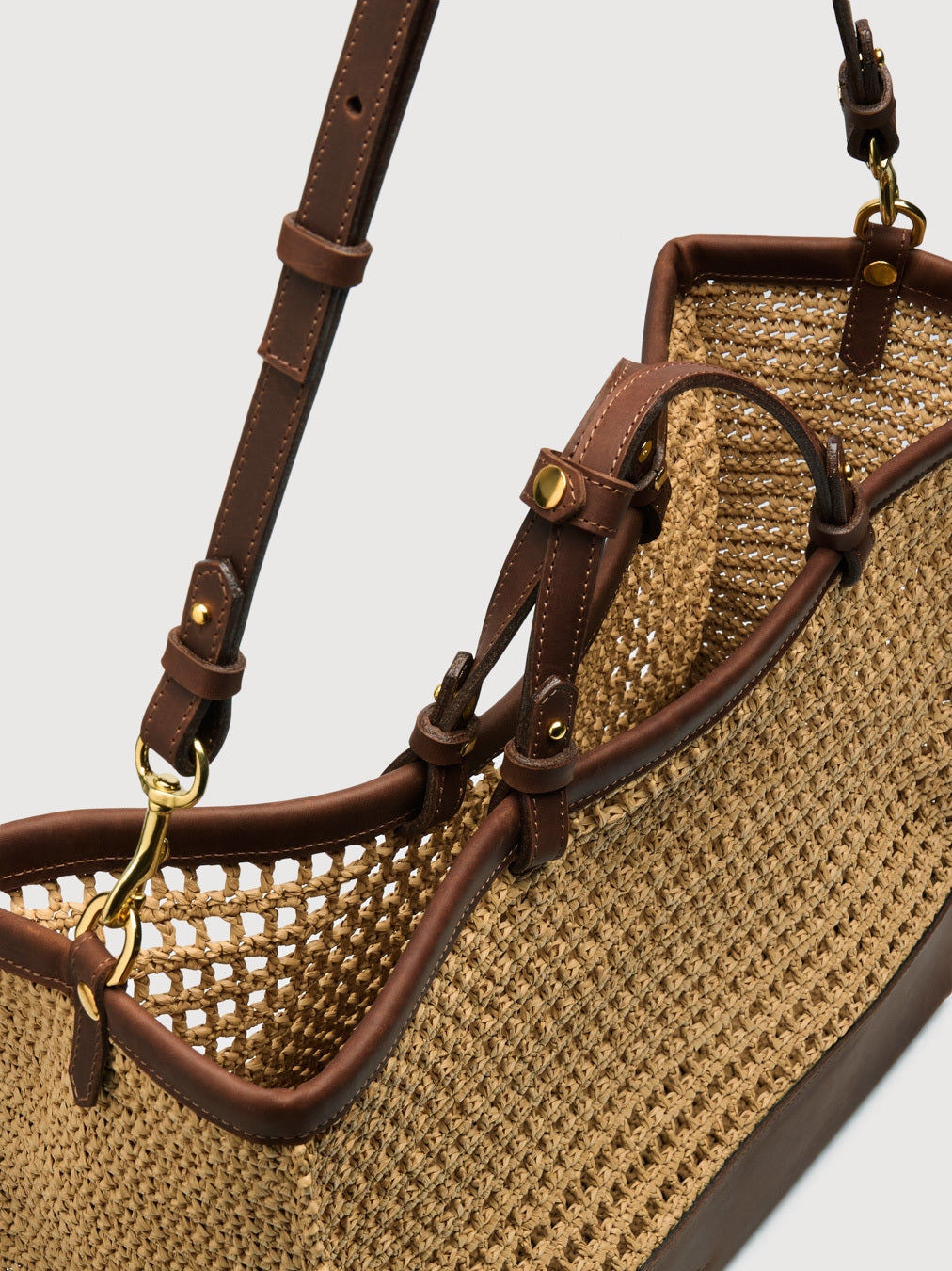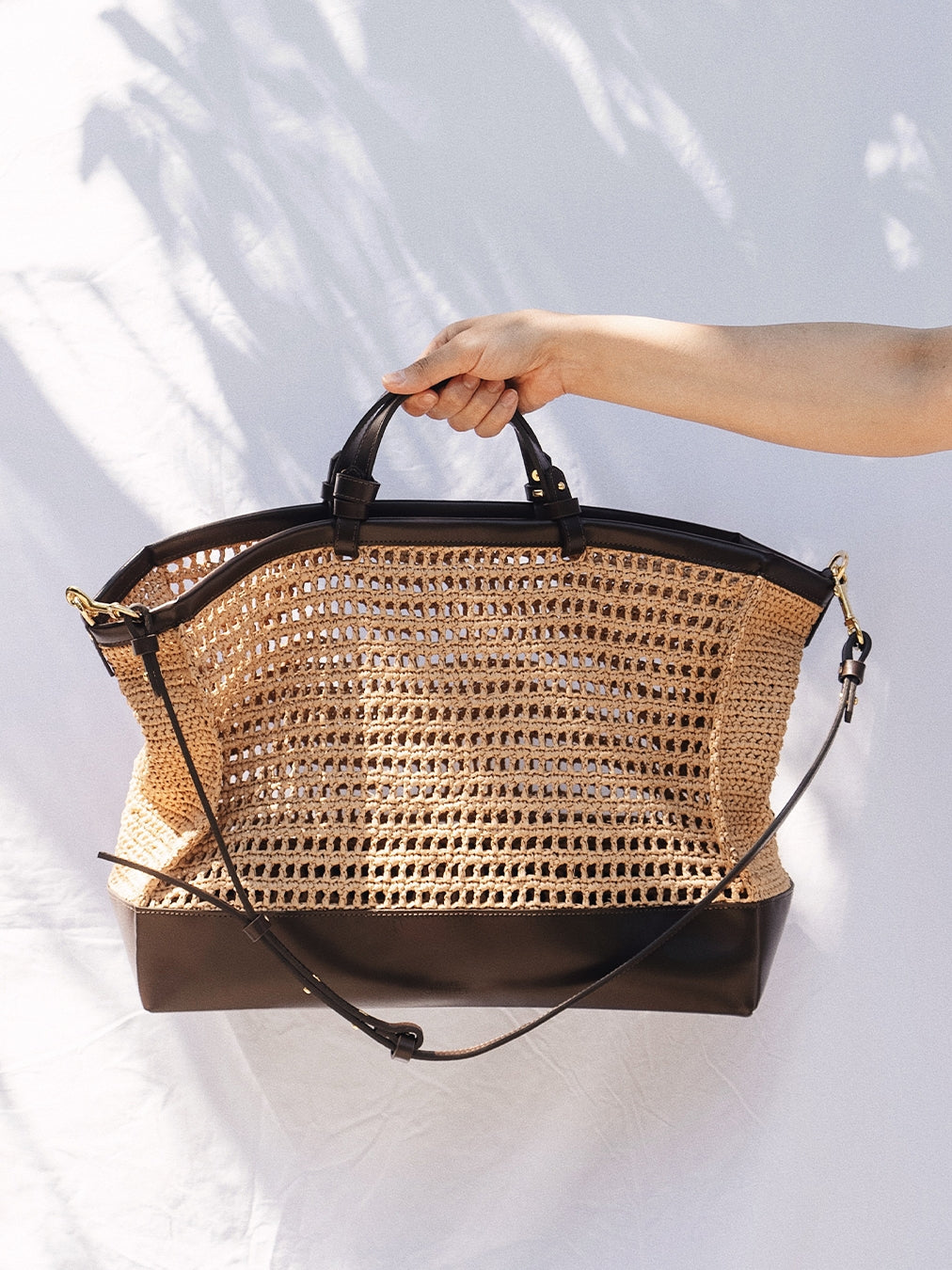 Behind the soft tote are 3 months of development and the finest handwork at all stages. Each bag is woven for 30 hours, after which the base, handles, shoulder strap and edges are painstakingly secured from genuine chocolate-colored leather. The laconic form is complemented by vintage fittings. The bag can change with your mood - just add a removable keychain, silk twill, pendants and other accessories to it.