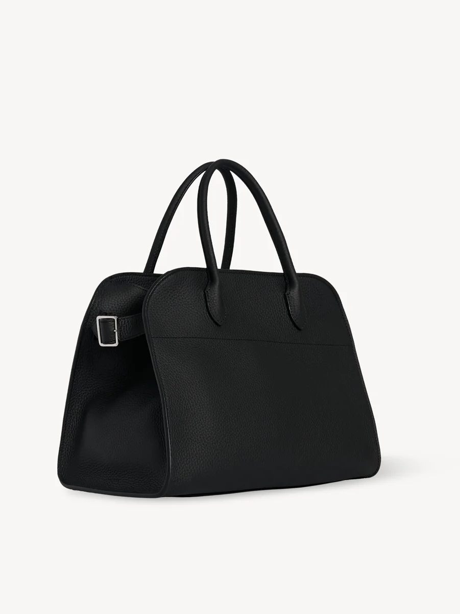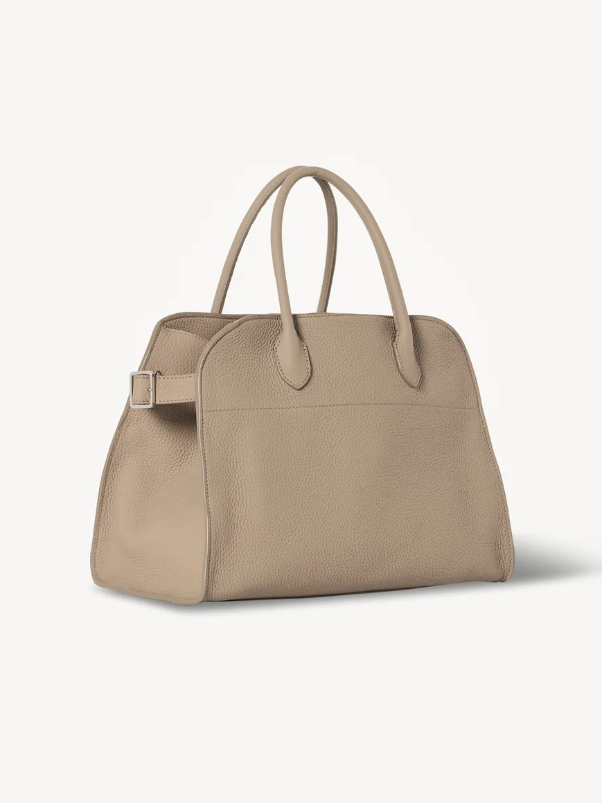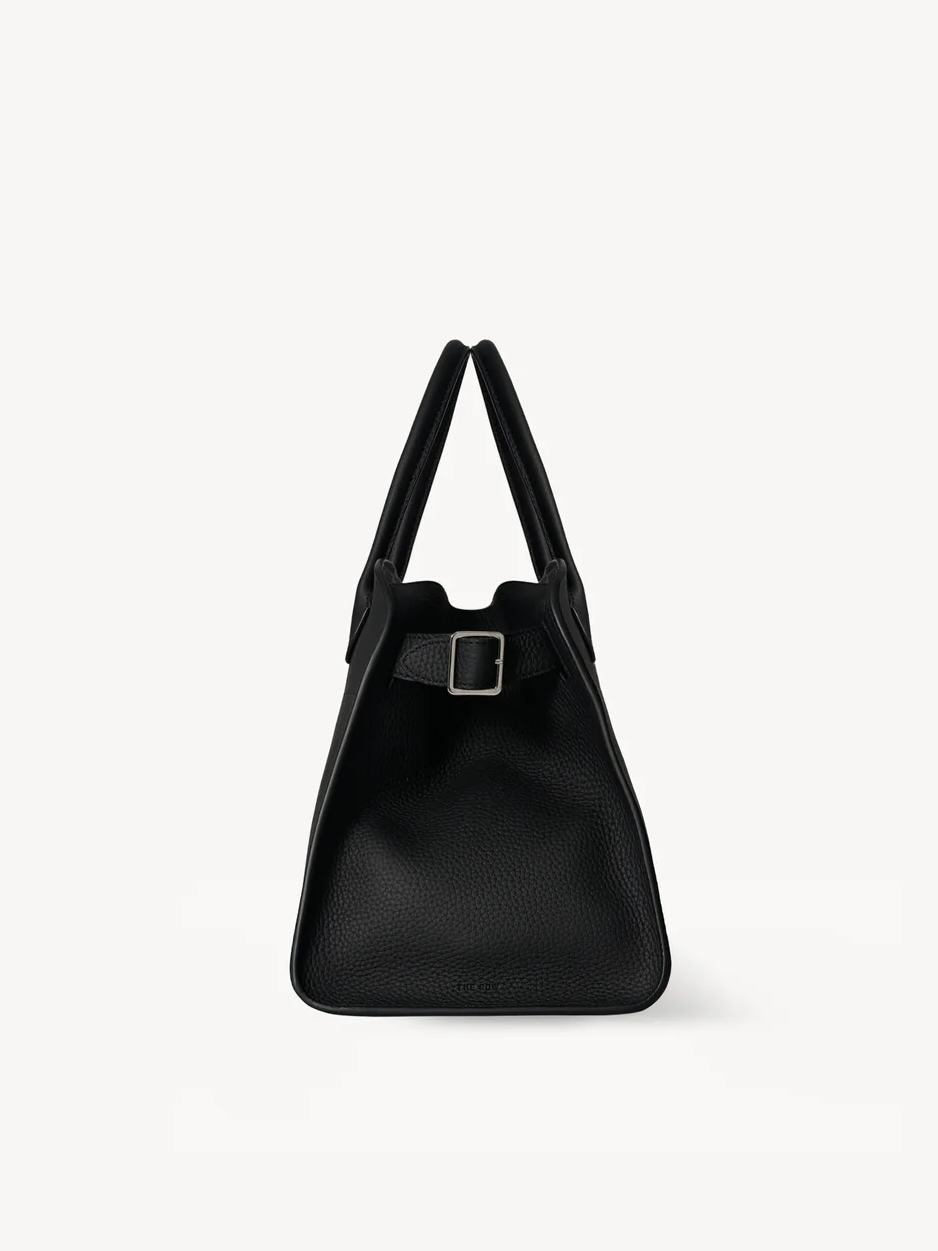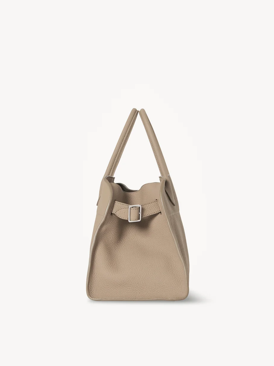 Softly structured top-handle bag in matte grained calfskin leather with belted gusseted side panels and interior toggle closure.