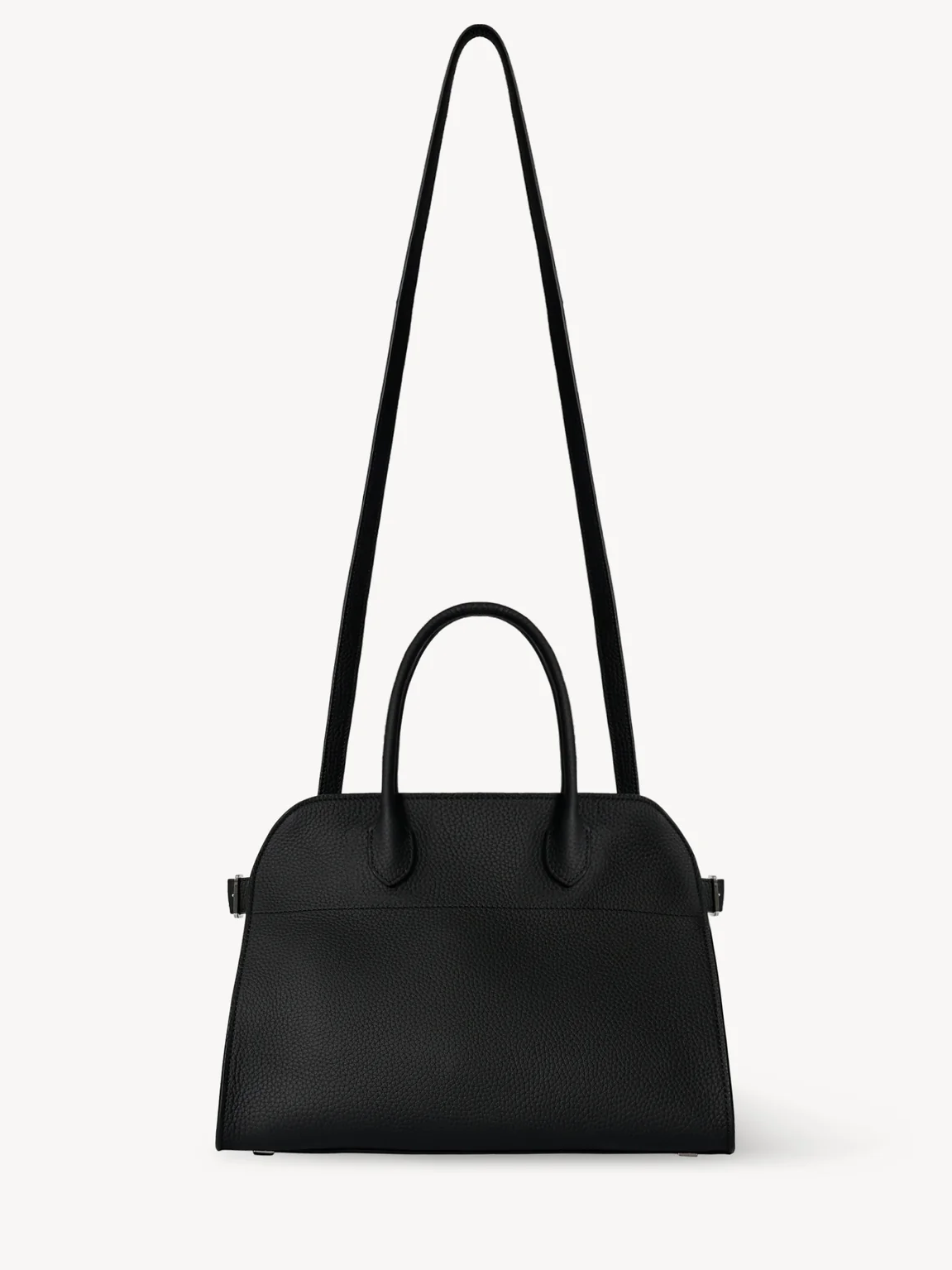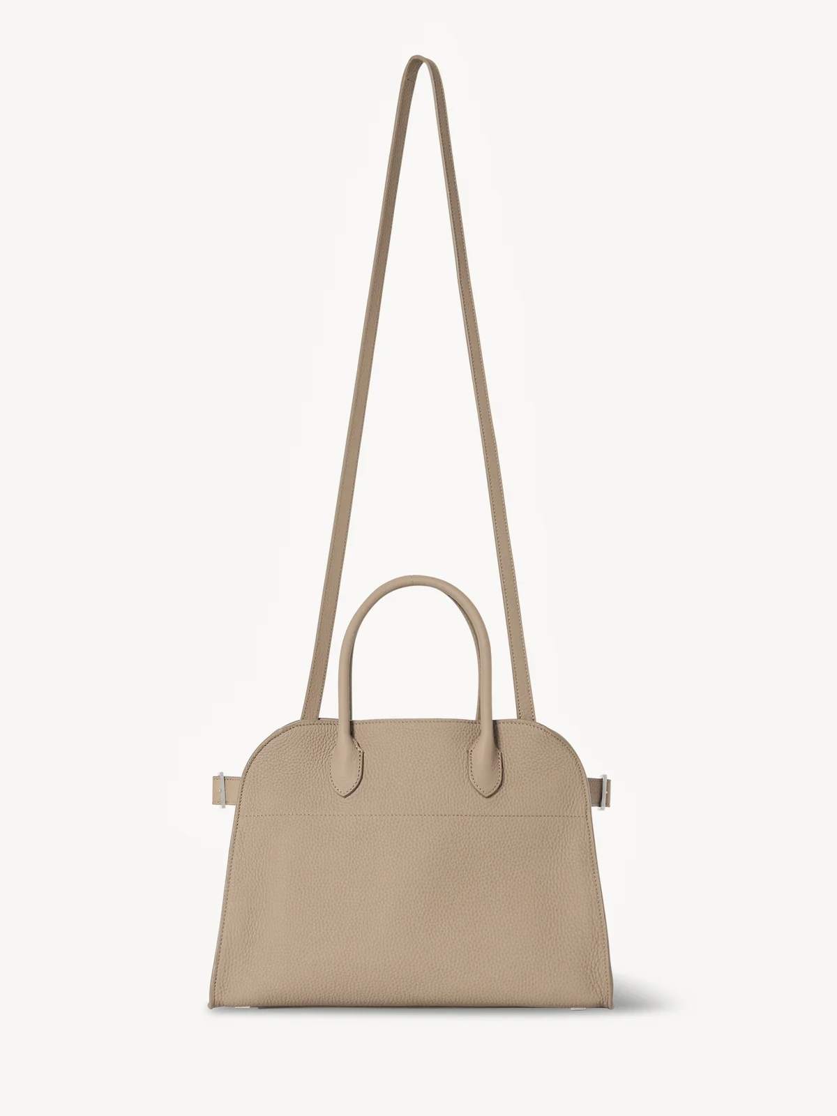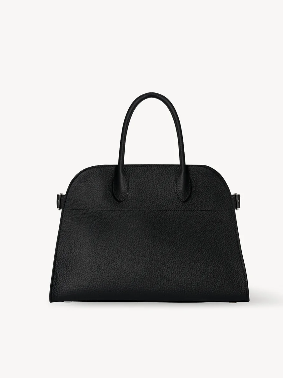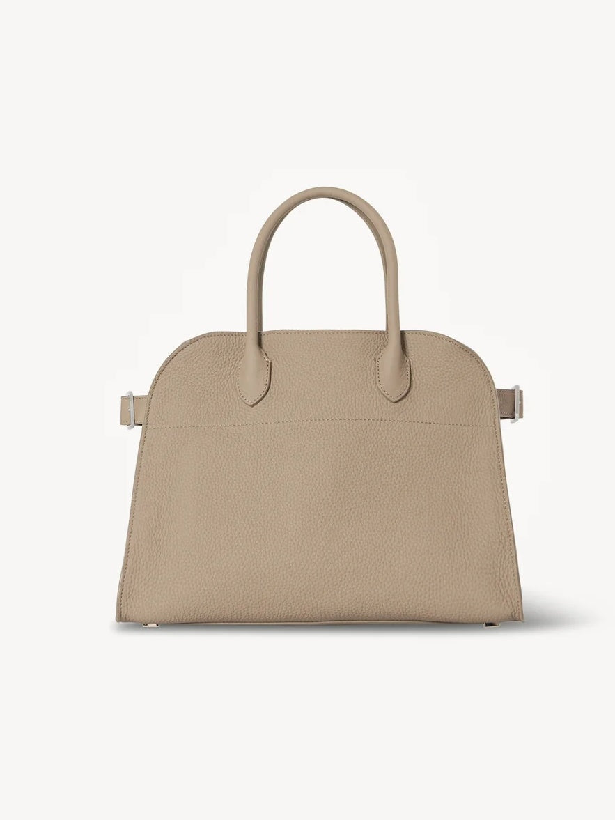 Softly structured top-handle bag in matte grained calfskin leather with belted gusseted side panels and interior toggle closure.