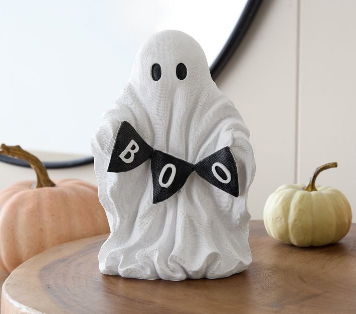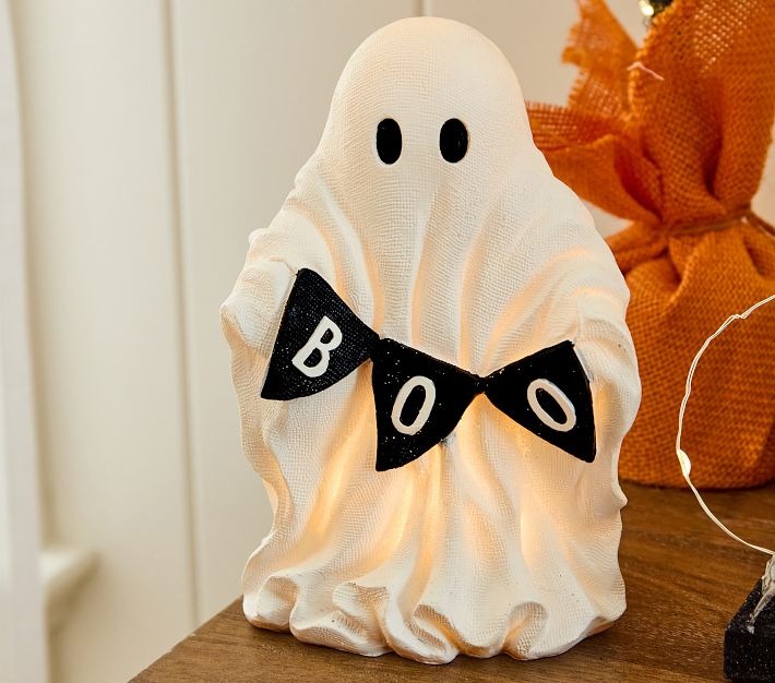 Our light-up ghost gives Halloween revelers a glowing welcome. Handcrafted of translucent white resin, it features scary detail, a sweet “BOO” banner and a bright LED bulbs.