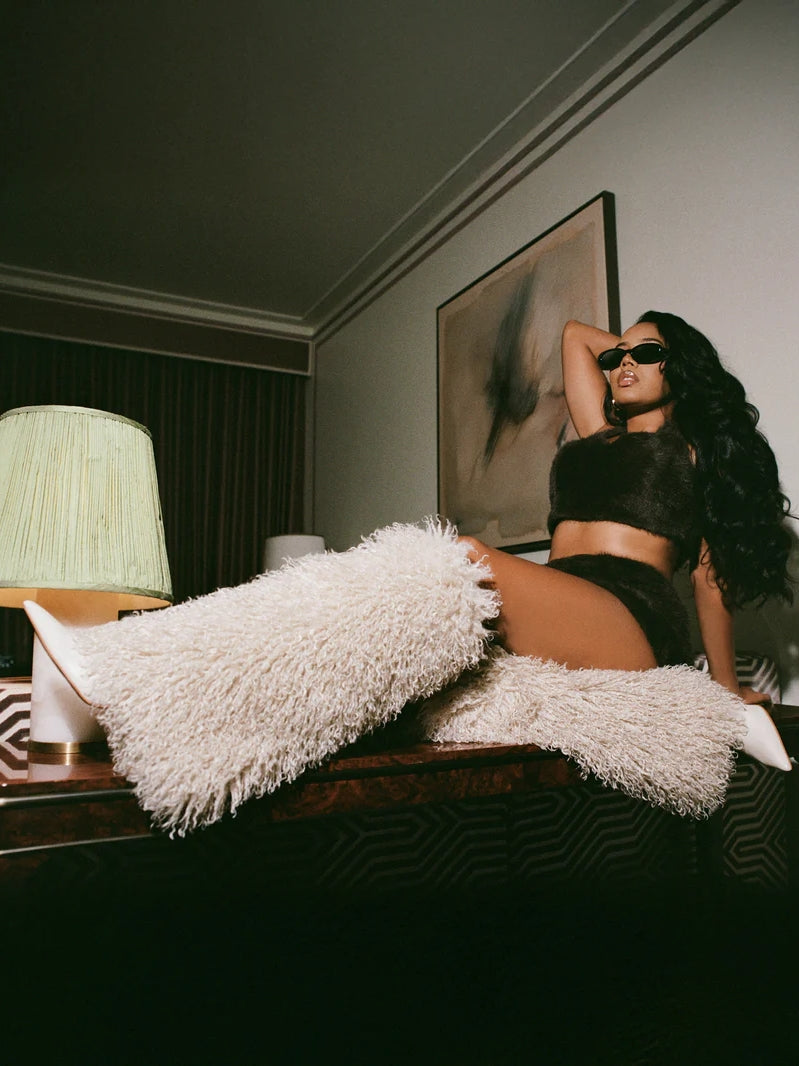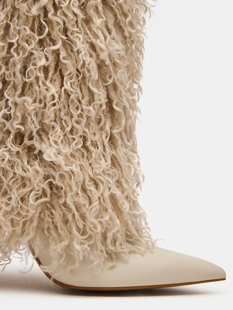 Experience sleek and edgy style. With a heeled stiletto and fold-over faux fur cuff, these knee-high boots are perfect for adding a touch of glam to any outfit. The pointed-toe design adds a chic touch, making these boots a must-have for any fashion-forward shoe lover.