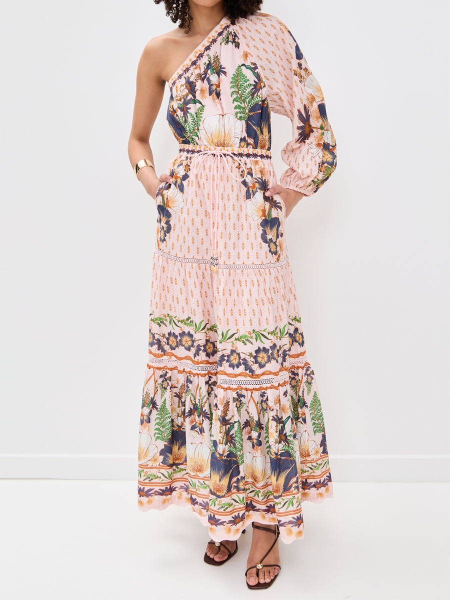 One-shoulder Drawstring Waist Printed Maxi Dress