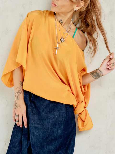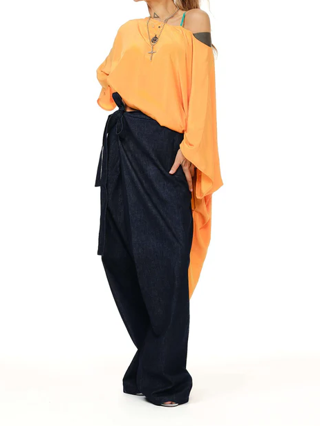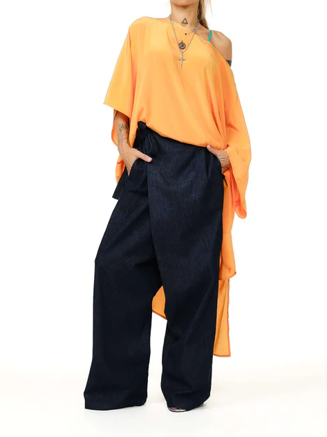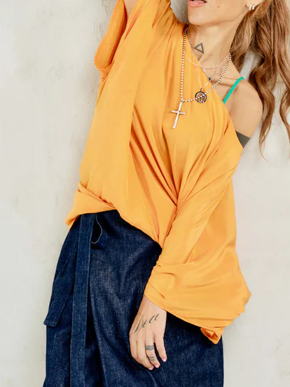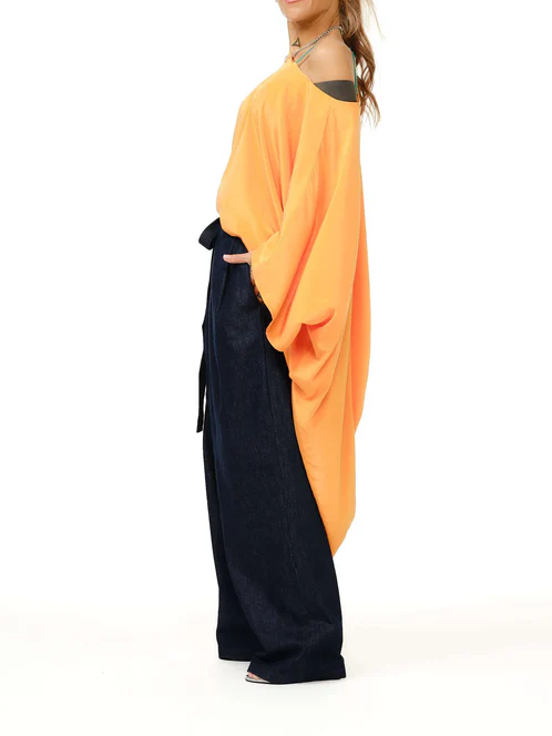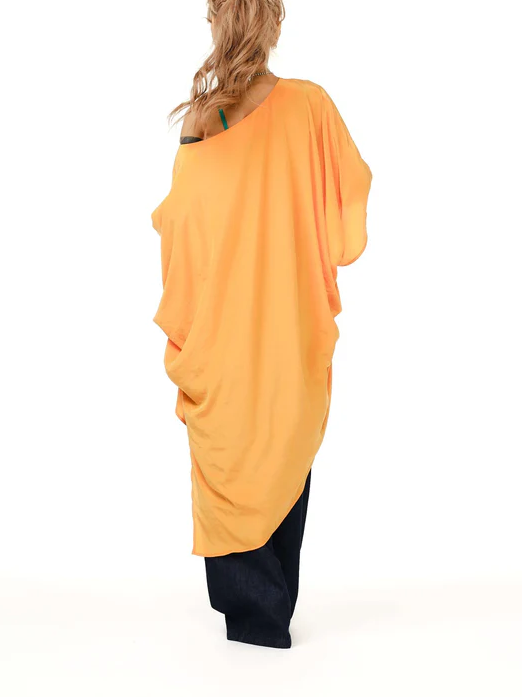 With its cascading silhouette and sunlit orange hue, this asymmetric top feels like summer in motion. Crafted from a soft fabric that catches the light as you move, it slips effortlessly off one shoulder for an undone elegance.
