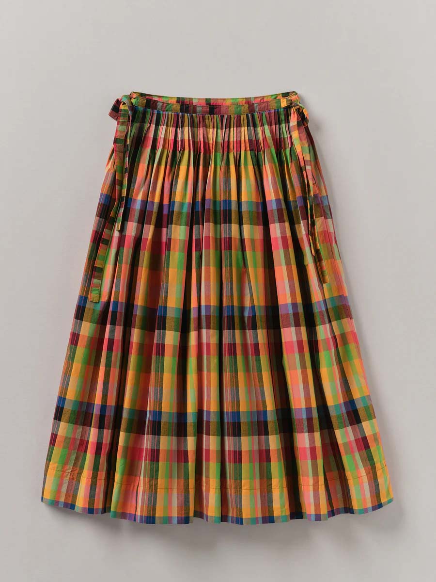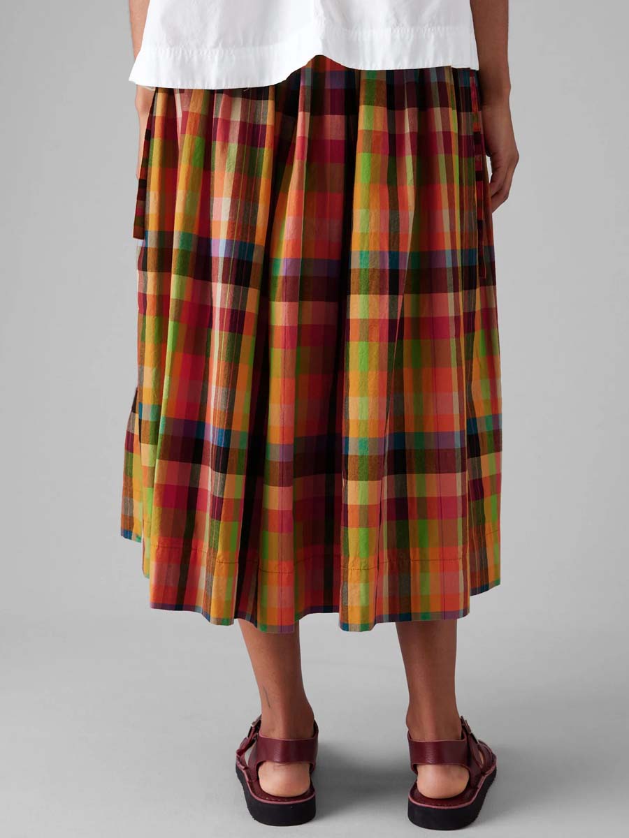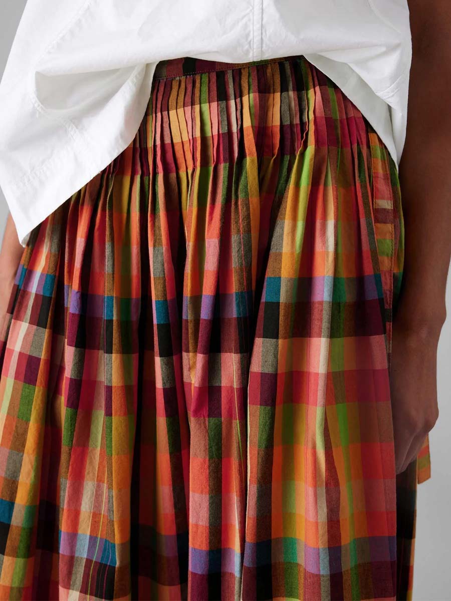 Made from a vibrant checked cotton, pintuck pleats give our skirt volume. It falls to a lower-calf length and features a tie closure on one side. Fastening with a corozo button placket at the side waist. Finished with side seam pockets.