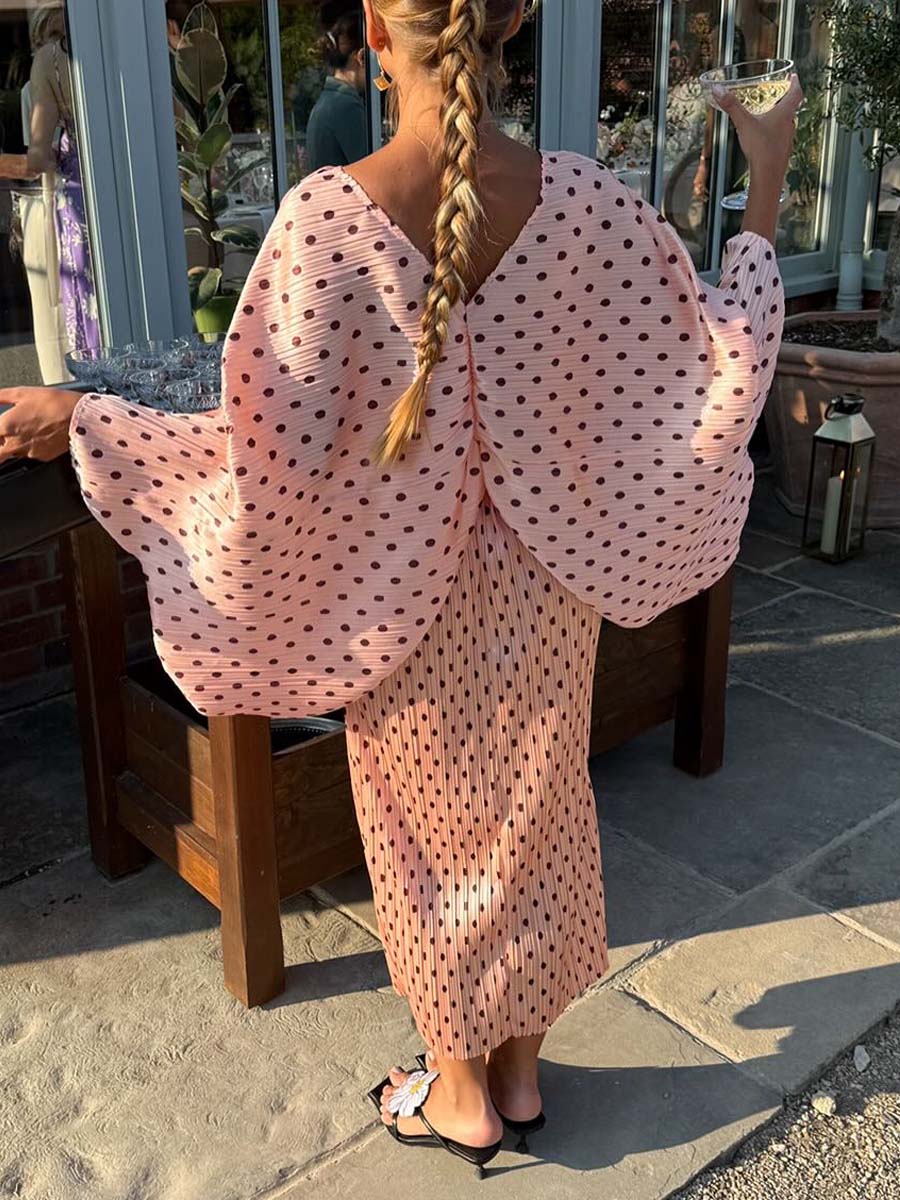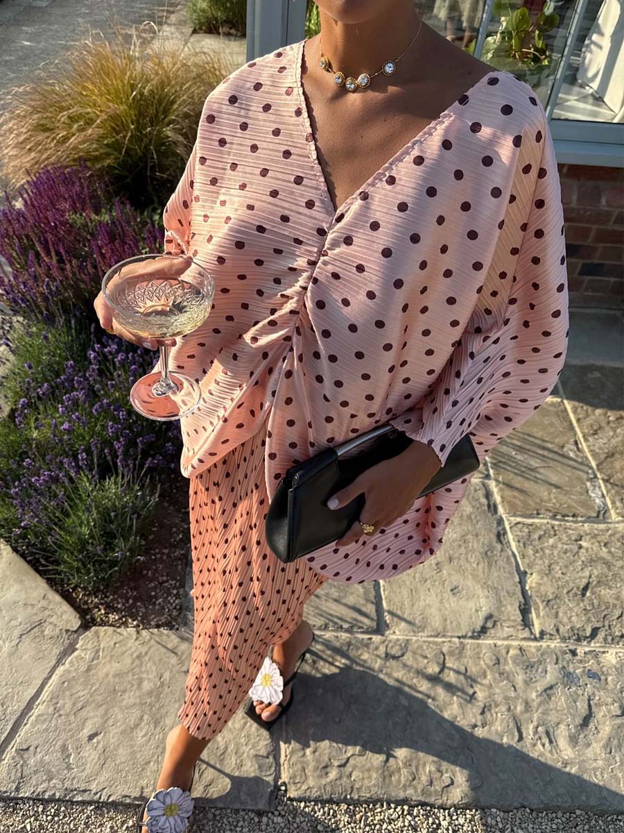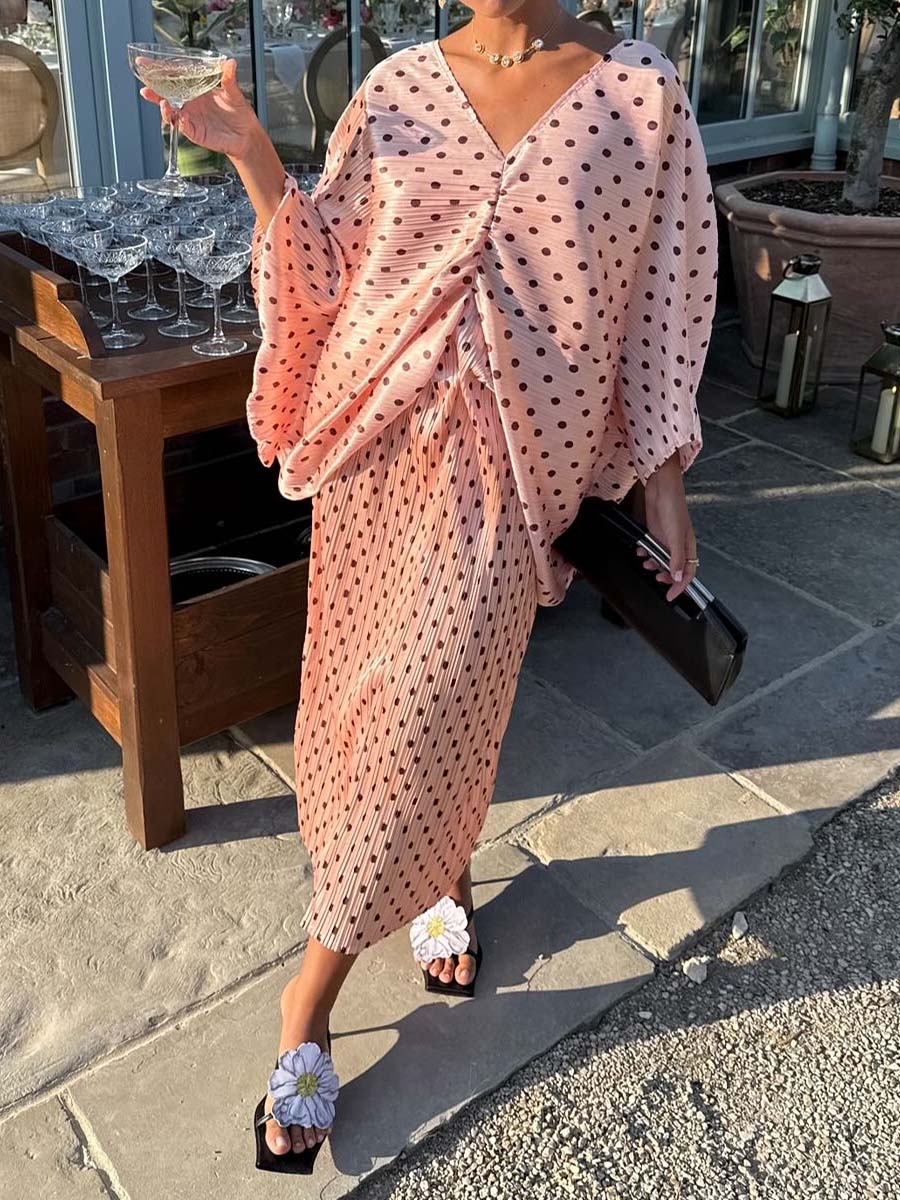 Add a touch of style to your wardrobe with our dress in a vibrant polka dot print in shades of pink and burgundy. Its flowing design and full silhouette with batwing sleeves create a comfortable yet sophisticated piece, perfect for any occasion. The V-neckline and draped front add a contemporary feel, while the color combination brings warmth and modernity.