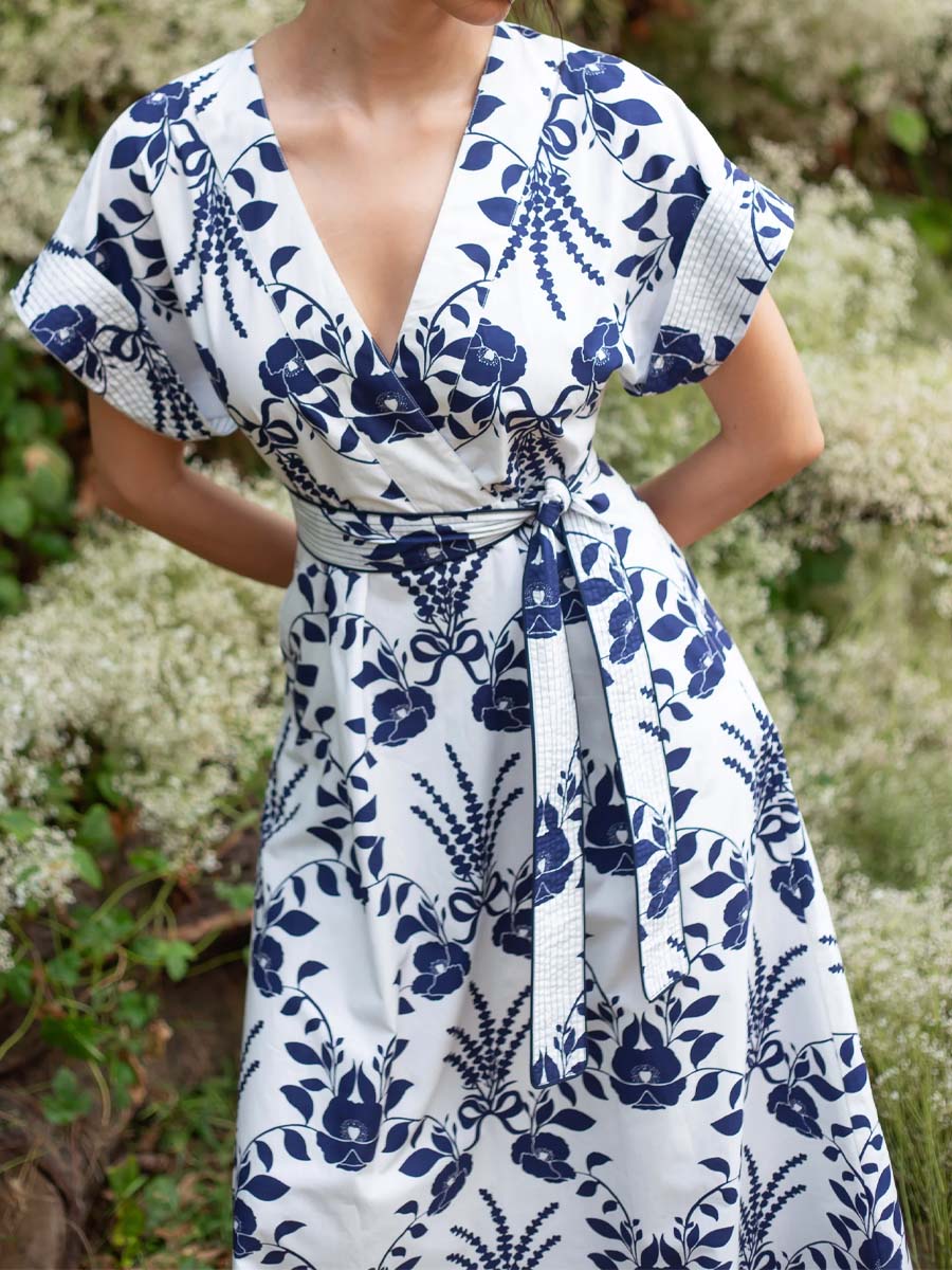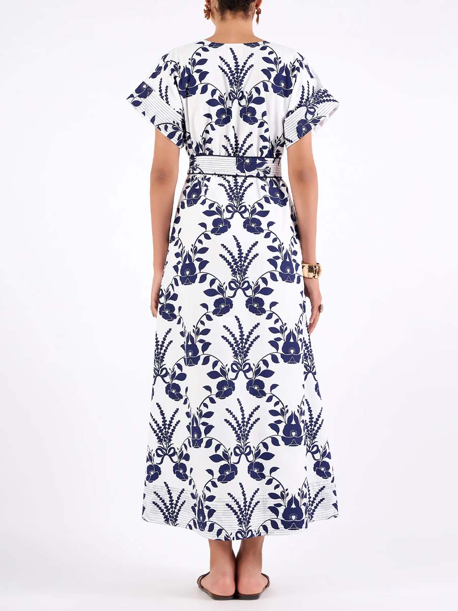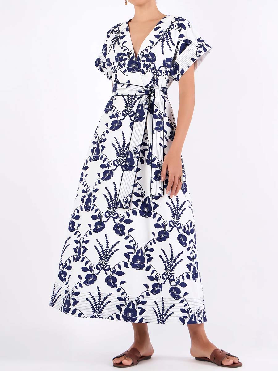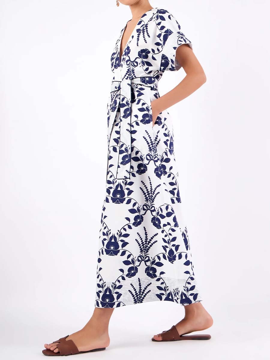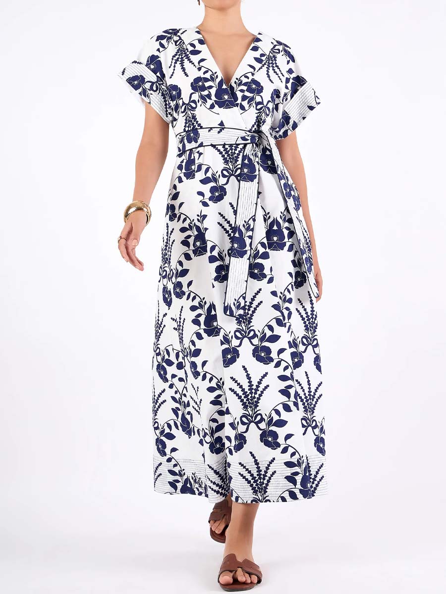 This coastal-inspired maxi is one of a kind. Featuring an original hand drawn print adorned with lavender and poppy flowers, short kimono sleeves, a V neckline, and a relaxed waistline with a self-tie belt to flatter, all constructed in super breathable cotton poplin. Style with a raffia handbag, gold hoops, and your favorite shades.