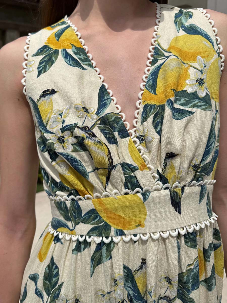 This midi-maxi dress features a stunning lemon garden print, perfect for a spring or summer event. Comfortable, stylish, and adorned with vibrant lemons and charming yellow birds, it's the ideal choice for a garden party or any special occasion.