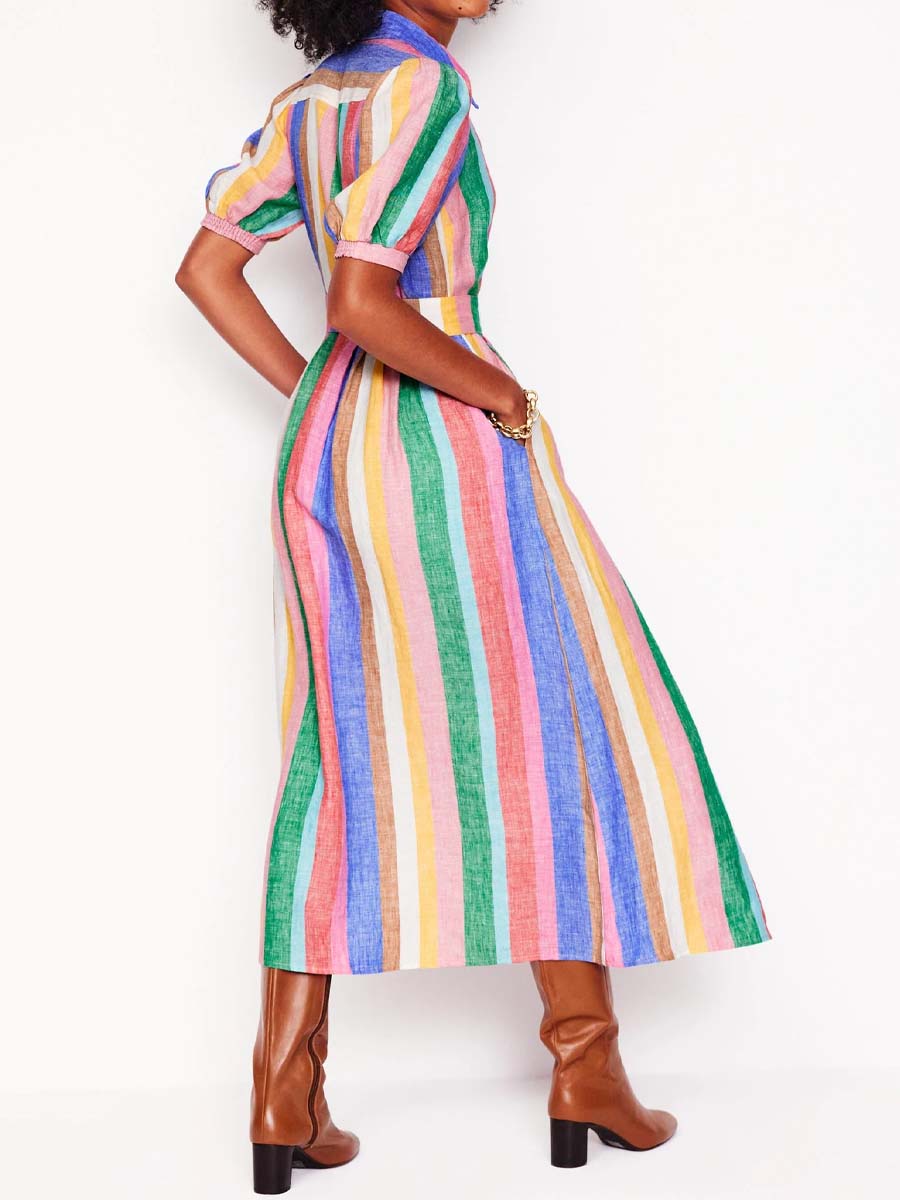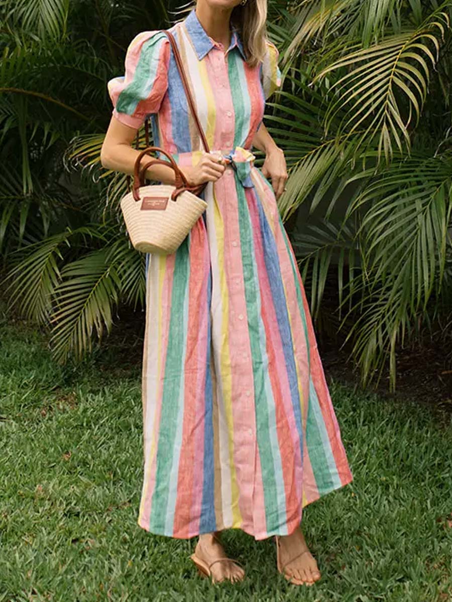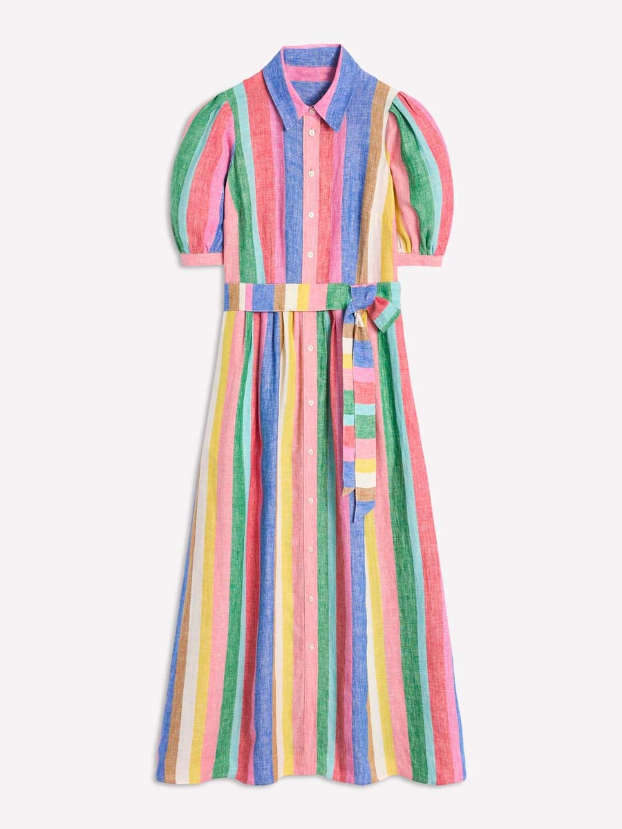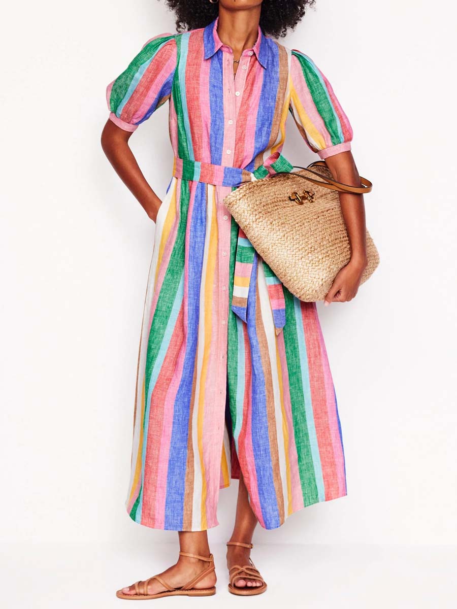 Subtly faded stripes amplify the vintage vibes of an airy linen shirtdress tied with a matching belt.