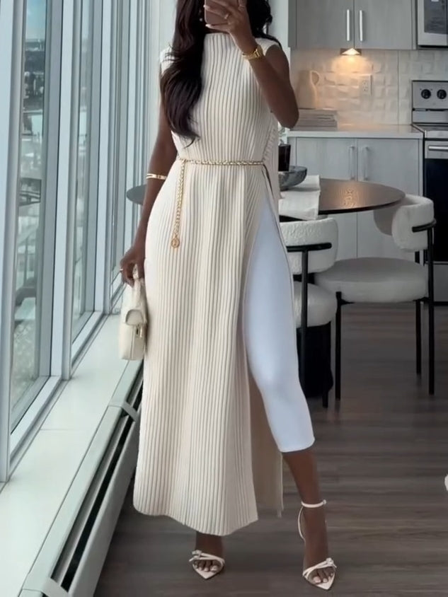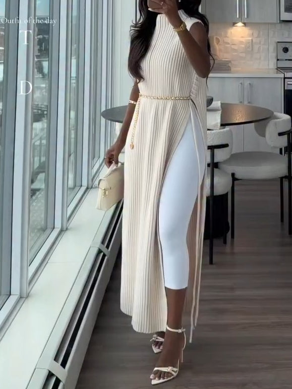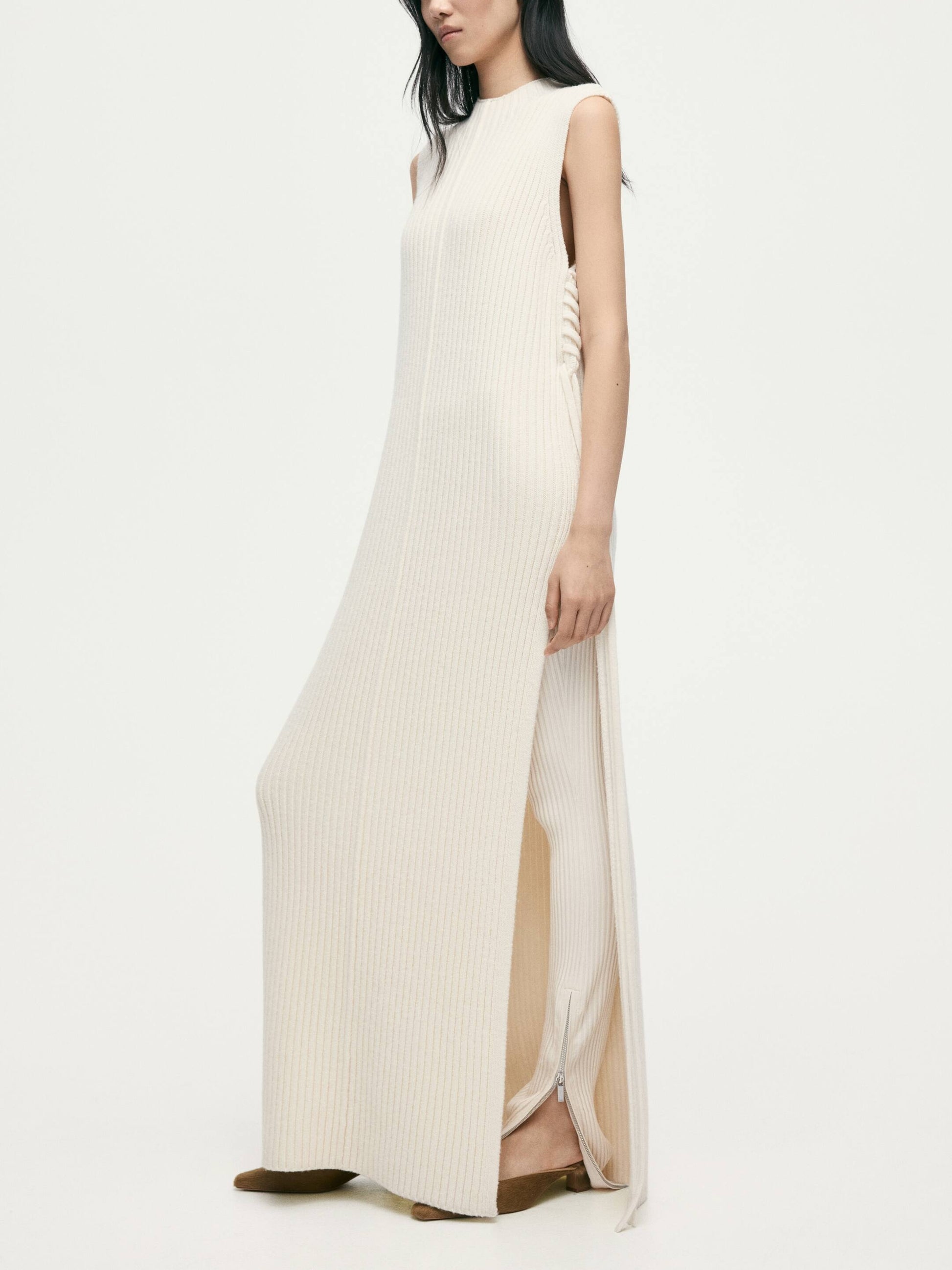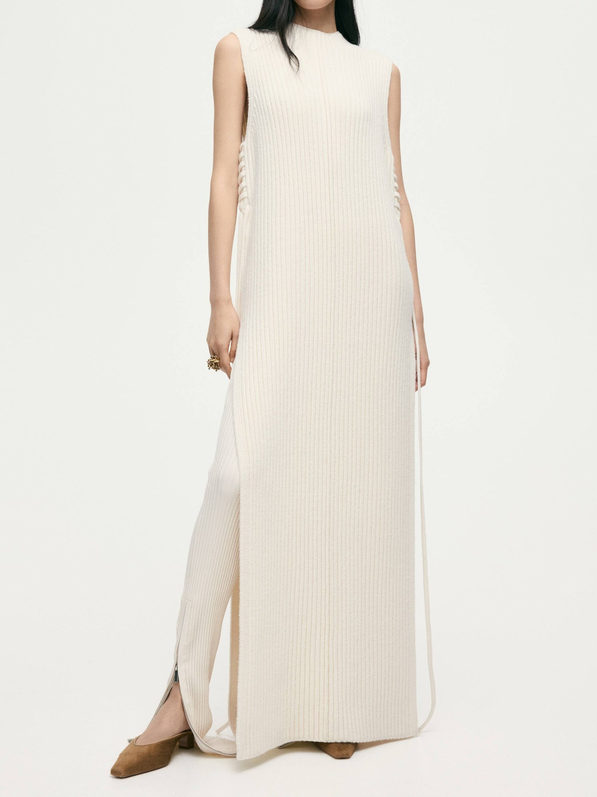 Long sweater vest in soft, rib-knit wool with a small stand collar and open sides with diagonal lacing at the top.