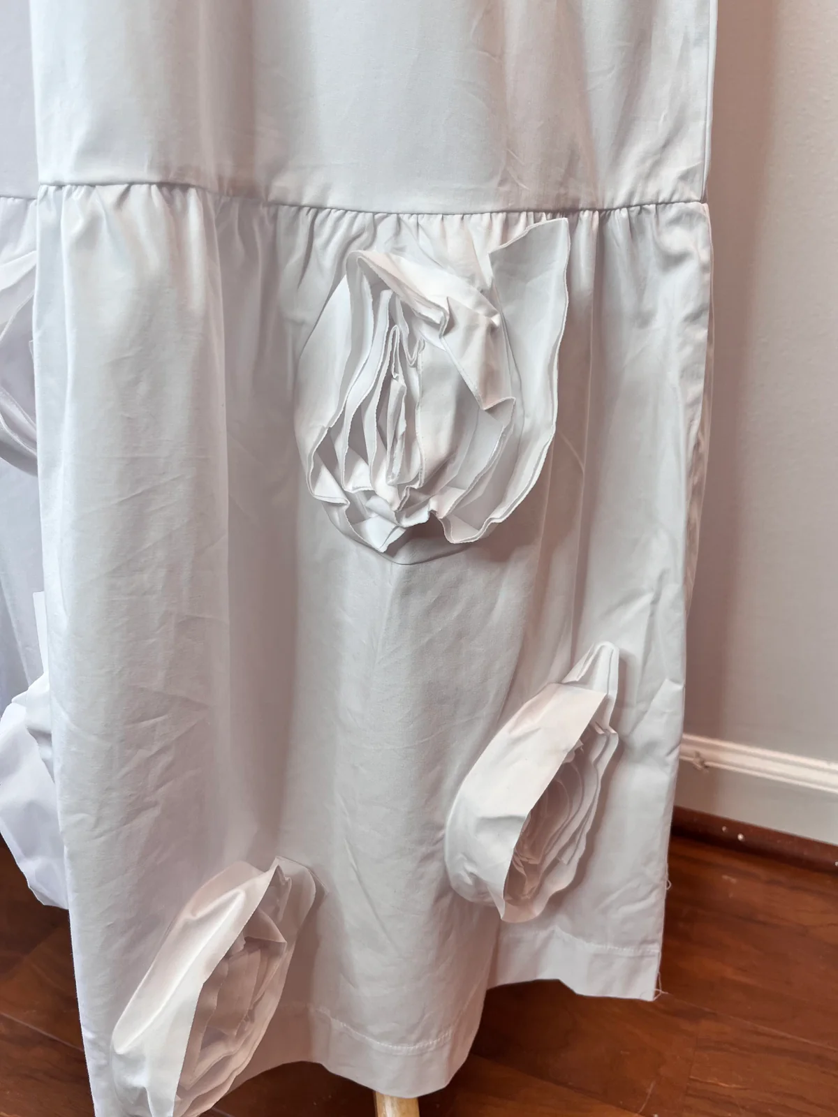 Let everyone go gaga over your simple and elegant taste in fashion wearing the Coming Up Roses Dress. The maxi-dress features a crew neck, a sleeveless design, a hidden pocket for storage, and a tiered skirt with roses detailing. This combination tiered dress with rosette appliques at the hem is a favorite, and it's great dressed up or down! It has a t-shirt top and a cotton poplin skirt. Knit: 95% Cotton, 5% Spandex. Woven: 100% Cotton. Machine wash.