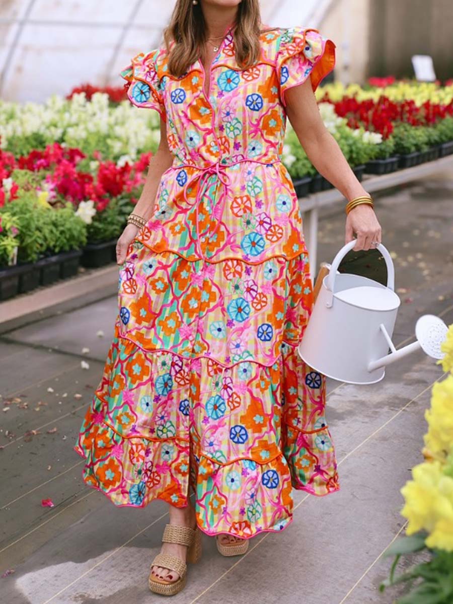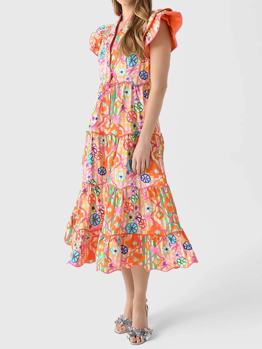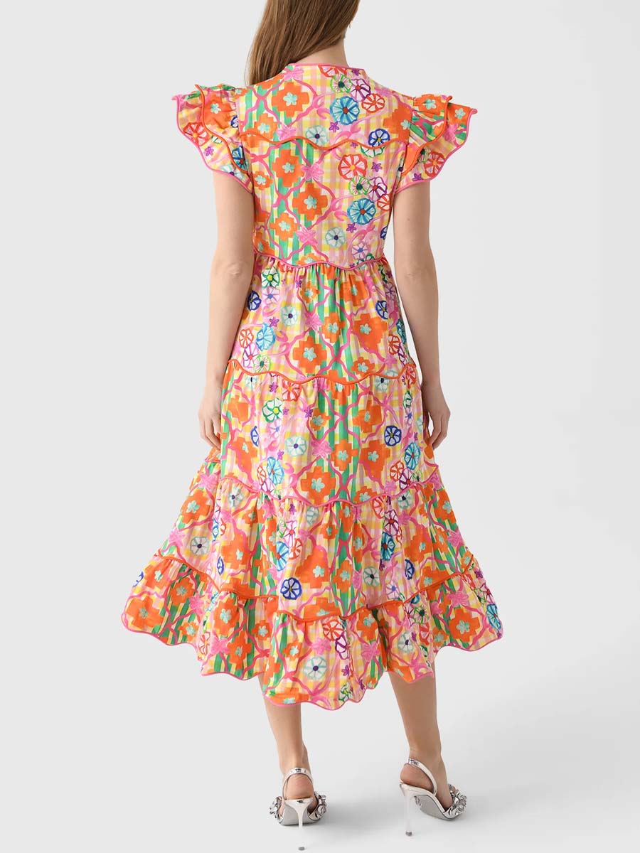 This dress is a celebration of color and print. Its playful mix of patterns and eye-catching hues make it the perfect statement piece for your summer wardrobe. The tiered skirt and ruffled sleeves add a touch of whimsy and movement.