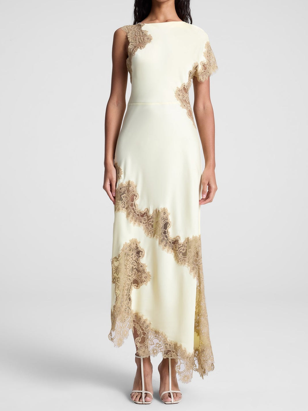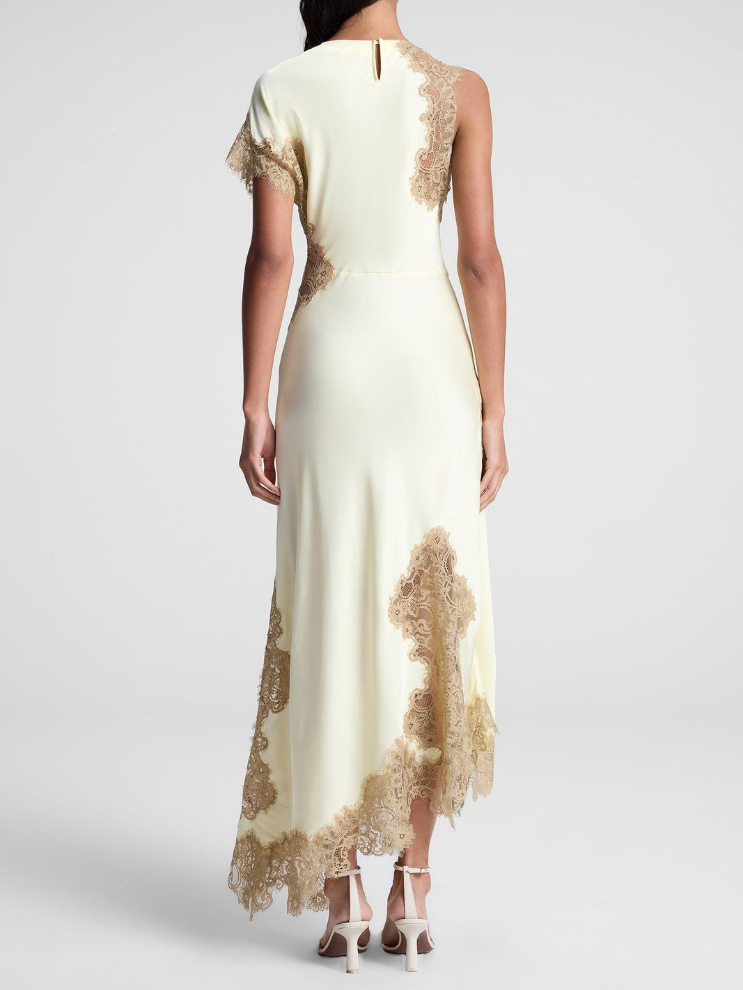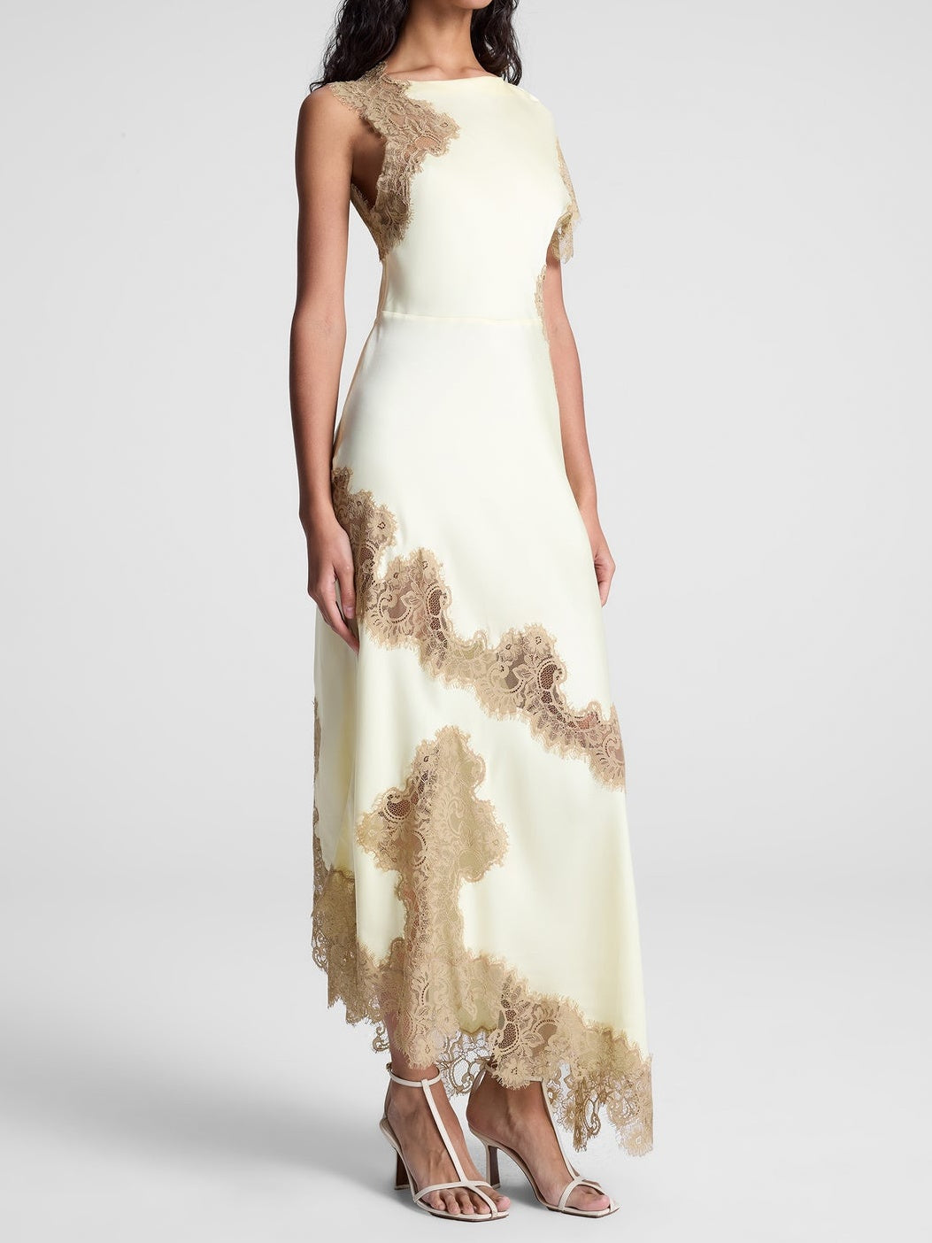 The Satin Dress is crafted from our fluid viscose fabric in a soft canary yellow hue. This bias-cut, asymmetrical silhouette skims the body, featuring beige eyelash lace paneling throughout and a back keyhole with a hook-and-eye closure.