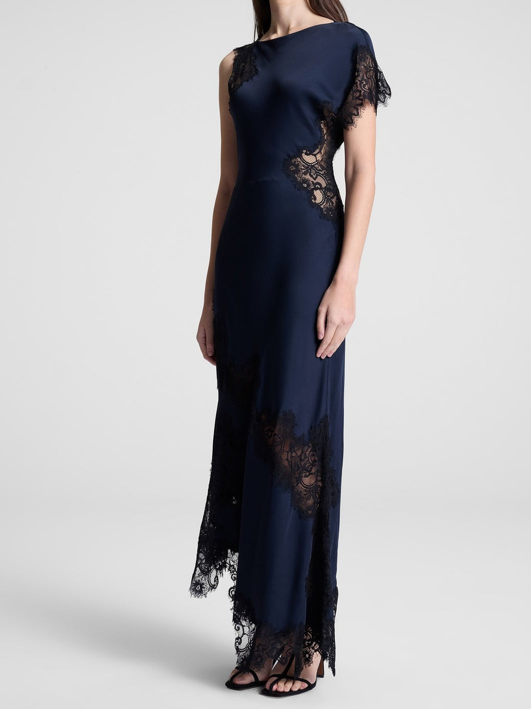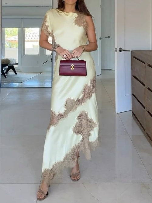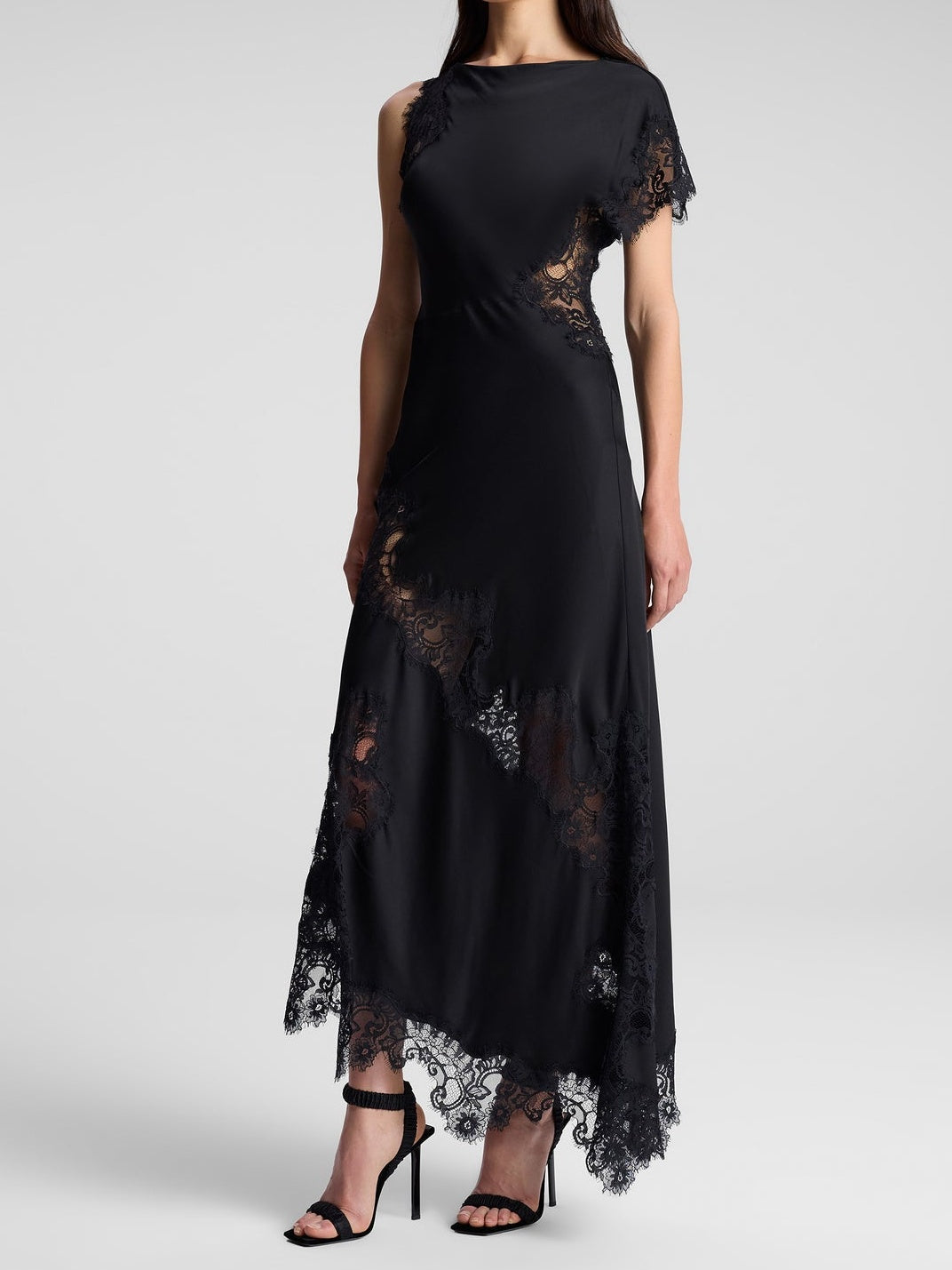 The Satin Dress is crafted from our fluid viscose fabric in a soft canary yellow hue. This bias-cut, asymmetrical silhouette skims the body, featuring beige eyelash lace paneling throughout and a back keyhole with a hook-and-eye closure.
