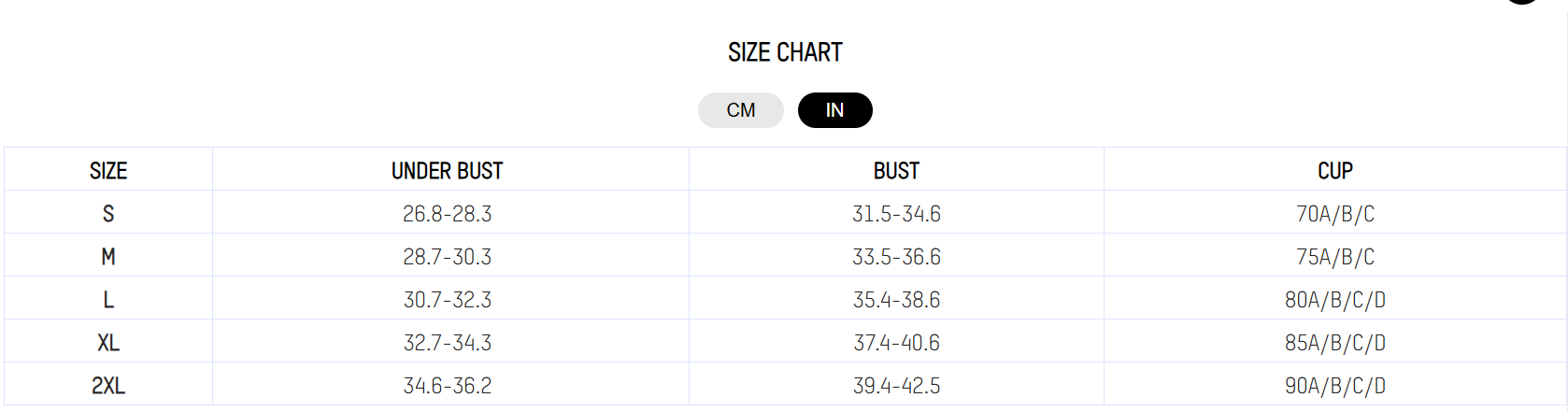 SIZE | UNDER BUST(IN) | BUST(IN) | CUP |