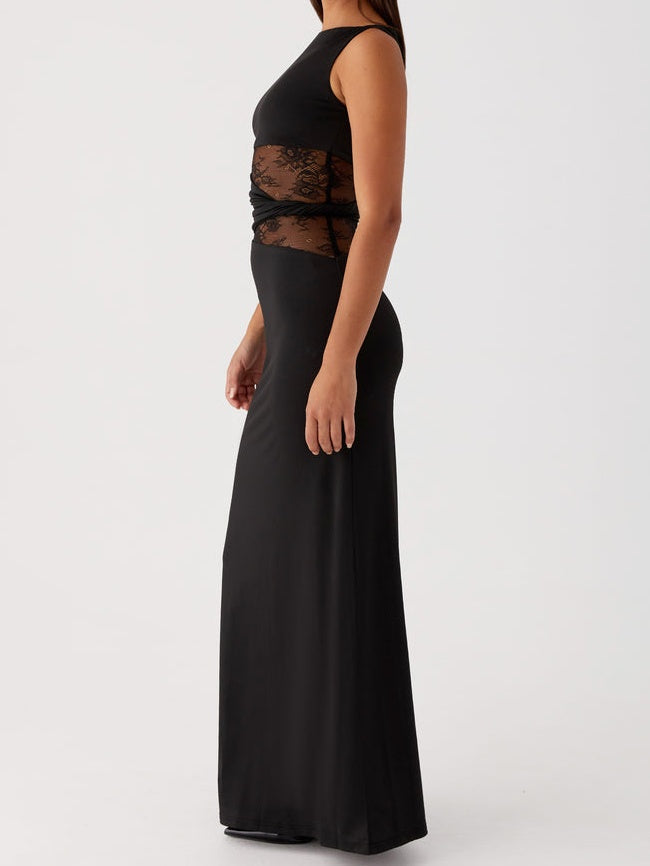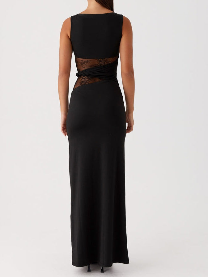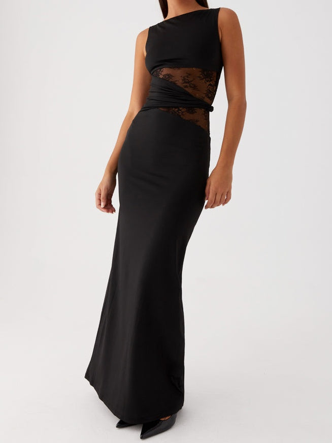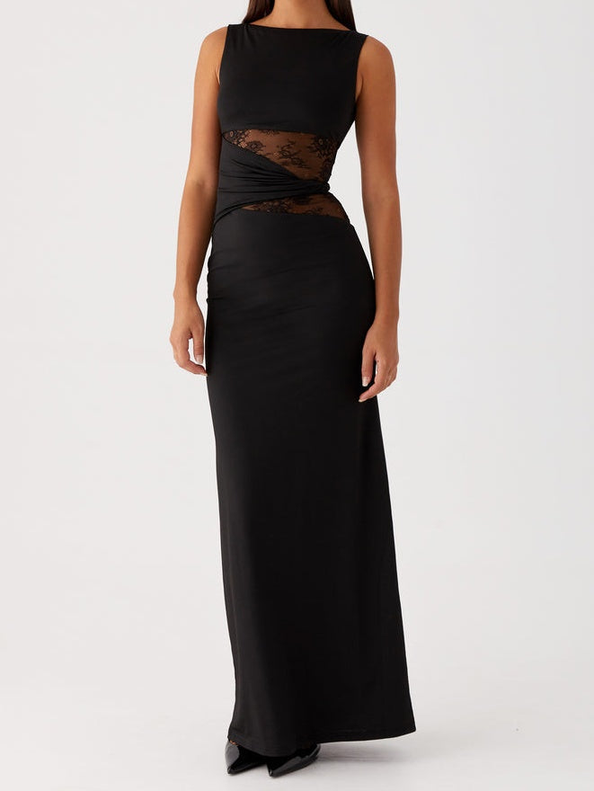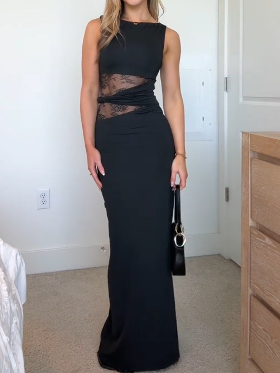 Elevate your evening style with the Flamepretty Maxi Dress. Featuring a rounded neckline and stretch jersey for a sleek fit, this dress is enhanced by a semi-sheer lace waist, blending comfort and allure for unforgettable nights.