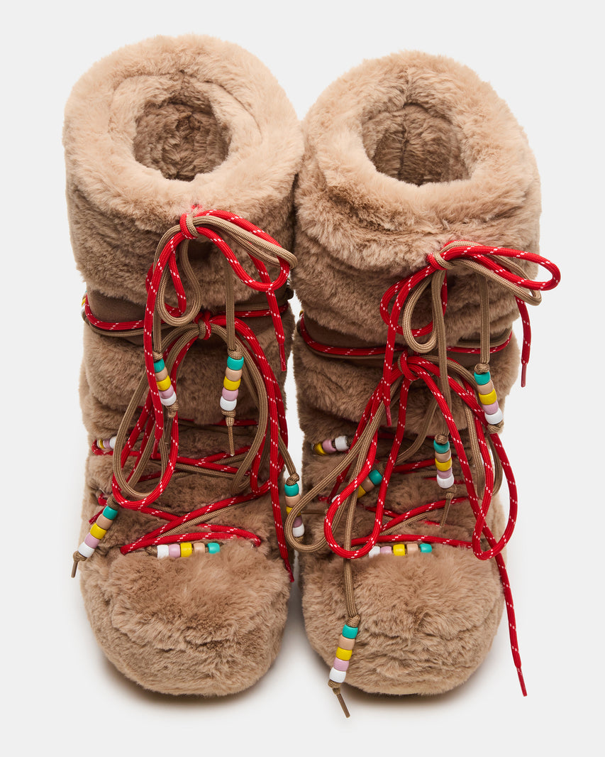 Elevate your footwear collection with the faux fur bootie, featuring a faux fur lining for warmth and comfort. Its chunky silhouette offers a bold, contemporary edge, while the multi-colored bead accents add a unique, artistic touch. Designed for both style and durability, this lace-up bootie seamlessly blends fashion-forward details with practical wearability.