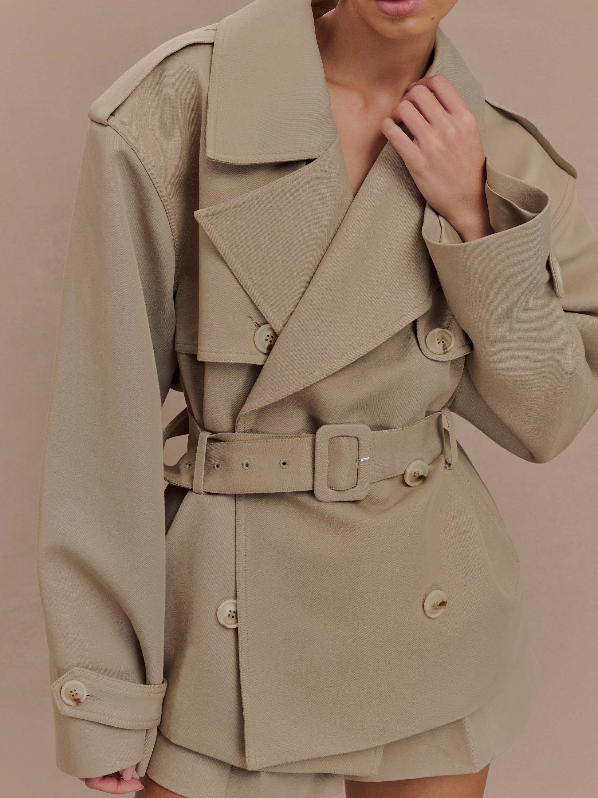 The Jacket offers a contemporary take on timeless outerwear. Designed with classic trench elements including shoulder epaulettes, raglan sleeves, a double breasted front, and a waist cinching belt, this cropped silhouette brings effortless polish to any look. Fully lined for comfort and structure, it features practical side pockets and functional belt loops for added versatility.