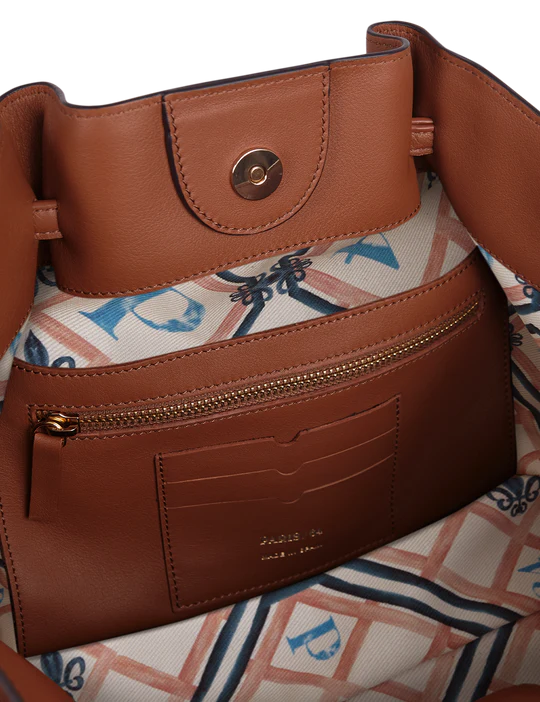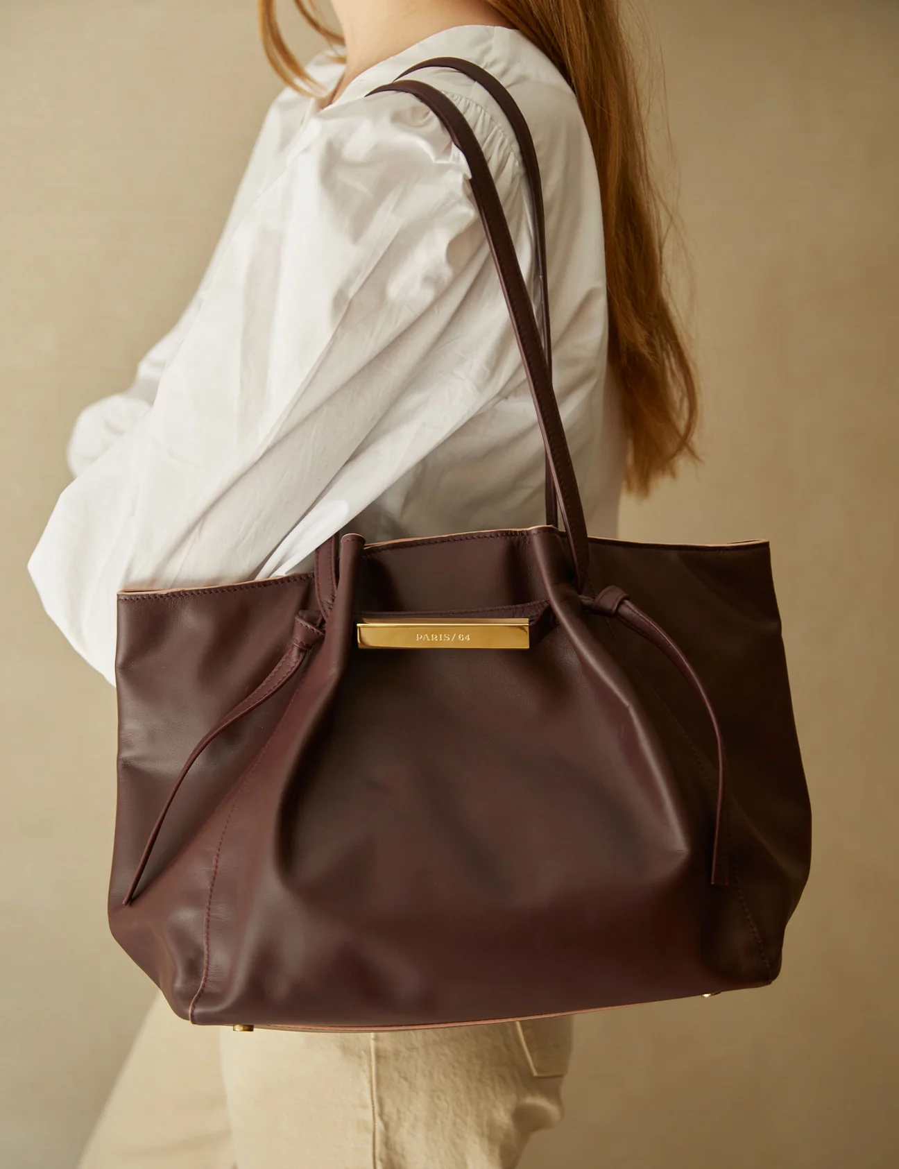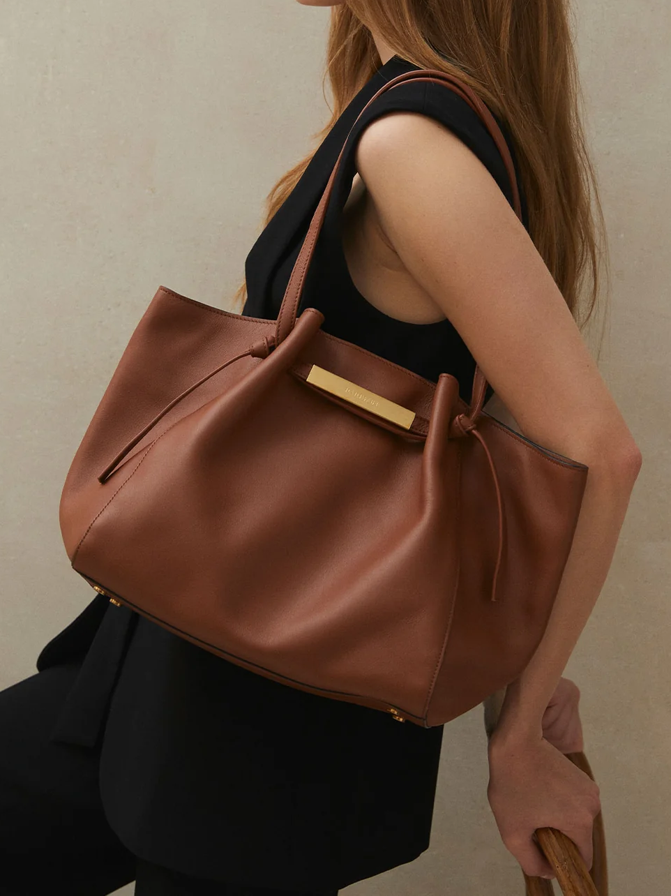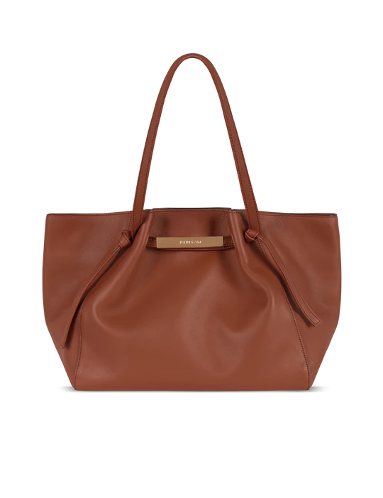 Brown shopper bag made of very soft and high quality cowhide leather. Lightweight and large capacity. Its modern yet timeless silhouette, luxurious gold-tone buckle and finish, as well as the texture and softness of the leather, make it the perfect day bag. Secure closure with a central magnet.
