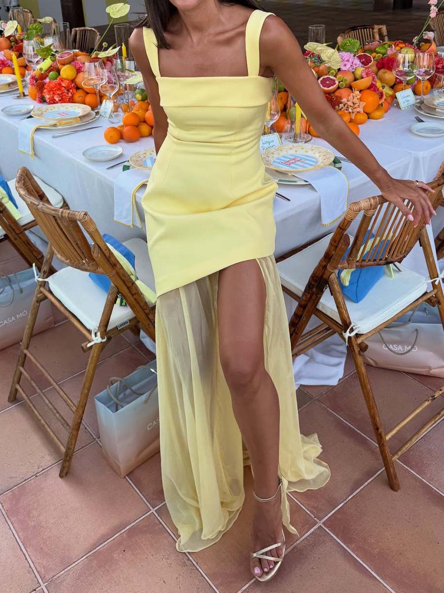 Dazzle at your next summer event with this yellow crepe long dress. Perfect for any event and for the most daring guests, with asymmetrical and flared skirt, with a vaporous finish with side slit, square neckline with wide straps and flap on the chest.