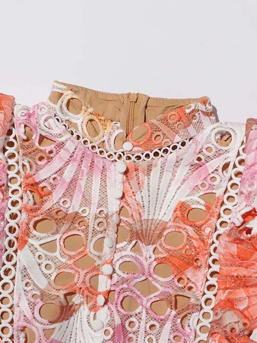 Stand Collar Sleeveless Cut-out Embroidered Dress